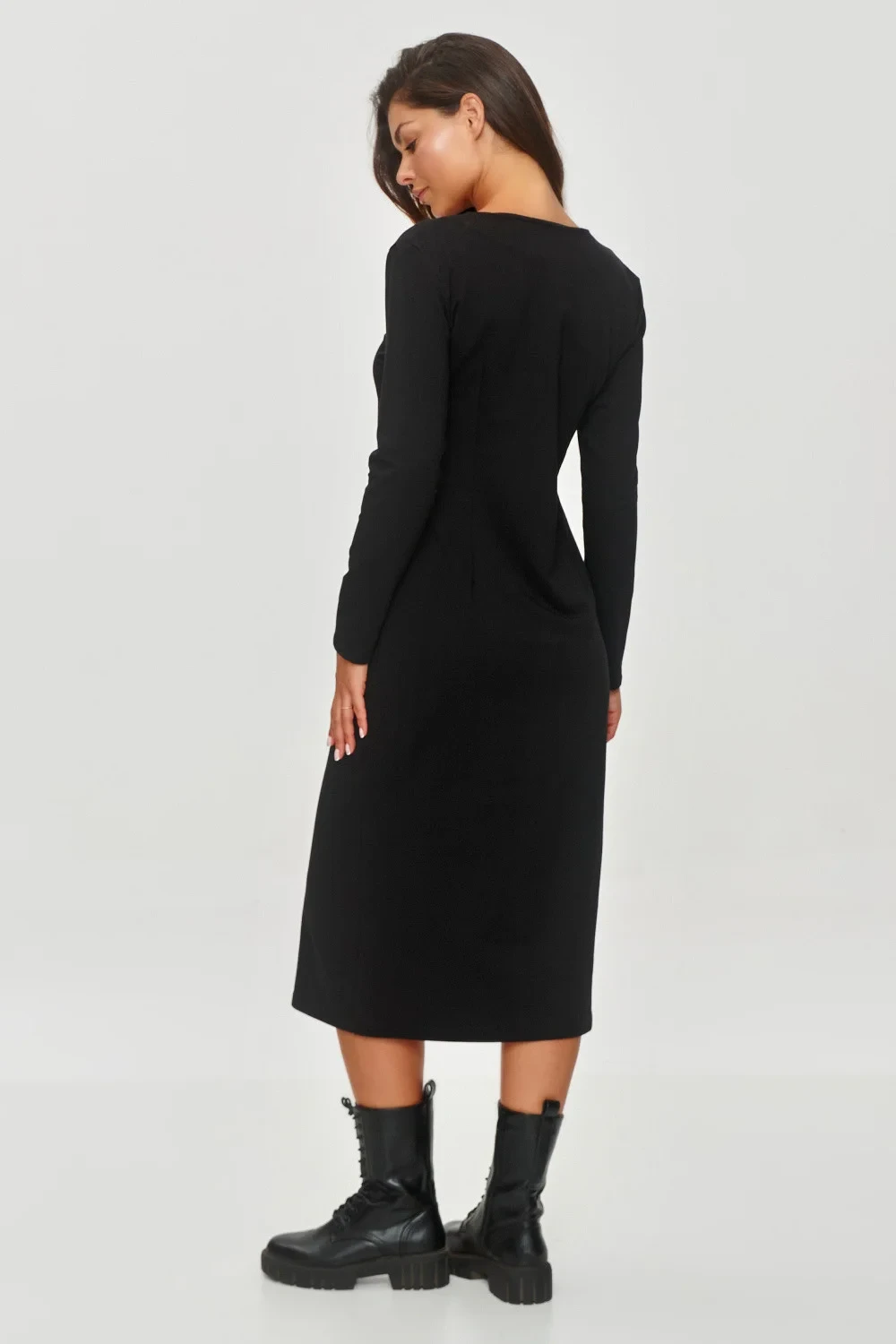 Dresové šaty jsou elegantní, ale zároveň jednoduchá nabídka na každý den, která kombinuje minimalismus s trochou stylu. Model má jednoduchý, přiléhající střih, který zdůrazňuje siluetu, ale zároveň zůstává pohodlný. Délka šatů sahá do poloviny lýtek, což jim dodává klasický charakter. Měkký a elastický materiál zajišťuje pohodlí nošení po celý den. Šaty mají dlouhé rukávy, ideální pro chladnější dny. Výstřih má tvar písmene V, který opticky prodlužuje krk a dodává eleganci. Na přední straně šatů se nachází subtilní rozštěp u spodu, který jim dodává lehkost a umožňuje volnost pohybu. Můžete je kombinovat s bílými teniskami, což dodá celkovému vzhledu sportovní, ale stále elegantní vzhled, nebo nosit s botkami nebo balerínami, aby se dosáhlo formálnějšího efektu. Tyto šaty jsou ideální volbou na každodenní vycházky, setkání s přáteli nebo do práce. Díky svému jednoduchému střihu a elegantním detailům se snadno stylizují na různé příležitosti.