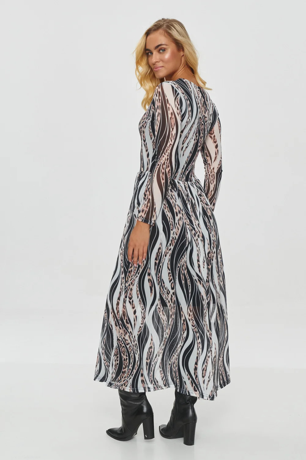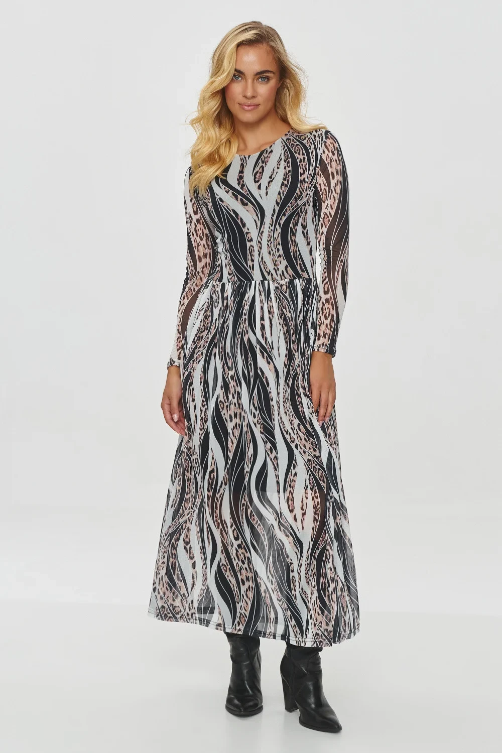 Dlouhé tištěné šaty vyrobené z lehkého, vzdušného materiálu, který jí dodává elegantní a romantický vzhled. Vzor šatů je složitá směs rostlinných, zvířecích a abstraktních motivů v převažujících barvách černé, bílé, béžové, hnědé a odstínech oranžové. Vzor je složitý a zároveň originální, což kreaci dodává výrazný styl. Model má lehce přizpůsobený vrchní díl, který zdůrazňuje pas, zatímco spodní část je rozkročená, co jí dodává lehkost a pohyb. Dokončení šatů je jemné a materiál je poloprůhledný, což zdůrazňuje jejich jemnost. Šaty mají viskózovou podšívku, která diskrétně zakrývá strategická místa a zajišťuje pohodlí při nošení. V kombinaci s těžkými kotníkovými botami vytváří kontrast s jemností šatů, což dává celku trochu více neformální vzhled. Šaty jsou ideální na podzimní nebo zimní večery díky svým teplým barvám a dlouhým rukávům. Kreace je k dispozici v pěti variantách, lišících se barvou a vzorem.