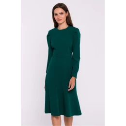 Elegantní tkané šaty s mírně rozšířeným střihem, ideální pro různé příležitosti. Dlouhé rukávy s nárameníky dodávají šatům módní nádech a manžety s knoflíčky zdůrazňují smysl pro detail. Šaty mají kulatý výstřih a krytý zip na zádech, který zajišťuje pohodlné nošení a minimalistický vzhled. Pásek zapínaný na dva hranaté knoflíky navíc krásně zvýrazňuje pas. Šaty nemají podšívku, takže jsou lehké a pohodlné. Jsou navrženy a ušity v Polsku a jsou ideální volbou pro ženy, které ocení styl a kvalitu.