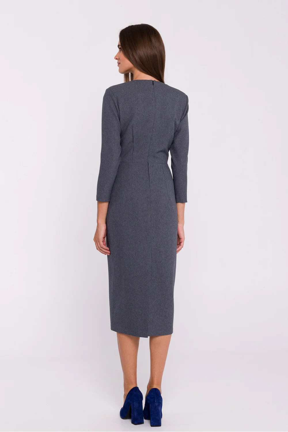Elegantní látkové šaty jednoduchého tužkového střihu, v pase vykrojené, což decentně zvýrazňuje siluetu. Výstřih do V dodává šatům elegantní nádech a opticky zeštíhluje dekolt. Midi délka zajišťuje klasický vzhled, ideální pro formální i neformální příležitosti. Šaty mají krytý zip na boku a podšívku pro pohodlí a dokonalé přizpůsobení. Dalším ozdobným prvkem je připevněná květina na hrudi, která dodává na originalitě. Šaty byly navrženy a ušity v Polsku a jsou ideální volbou pro ženy, které ocení styl a eleganci.