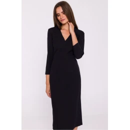 Elegantní látkové šaty jednoduchého tužkového střihu, v pase vykrojené, což decentně zvýrazňuje siluetu. Výstřih do V dodává šatům elegantní nádech a opticky zeštíhluje dekolt. Midi délka zajišťuje klasický vzhled, ideální pro formální i neformální příležitosti. Šaty mají krytý zip na boku a podšívku pro pohodlí a dokonalé přizpůsobení. Dalším ozdobným prvkem je připevněná květina na hrudi, která dodává na originalitě. Šaty byly navrženy a ušity v Polsku a jsou ideální volbou pro ženy, které ocení styl a eleganci.