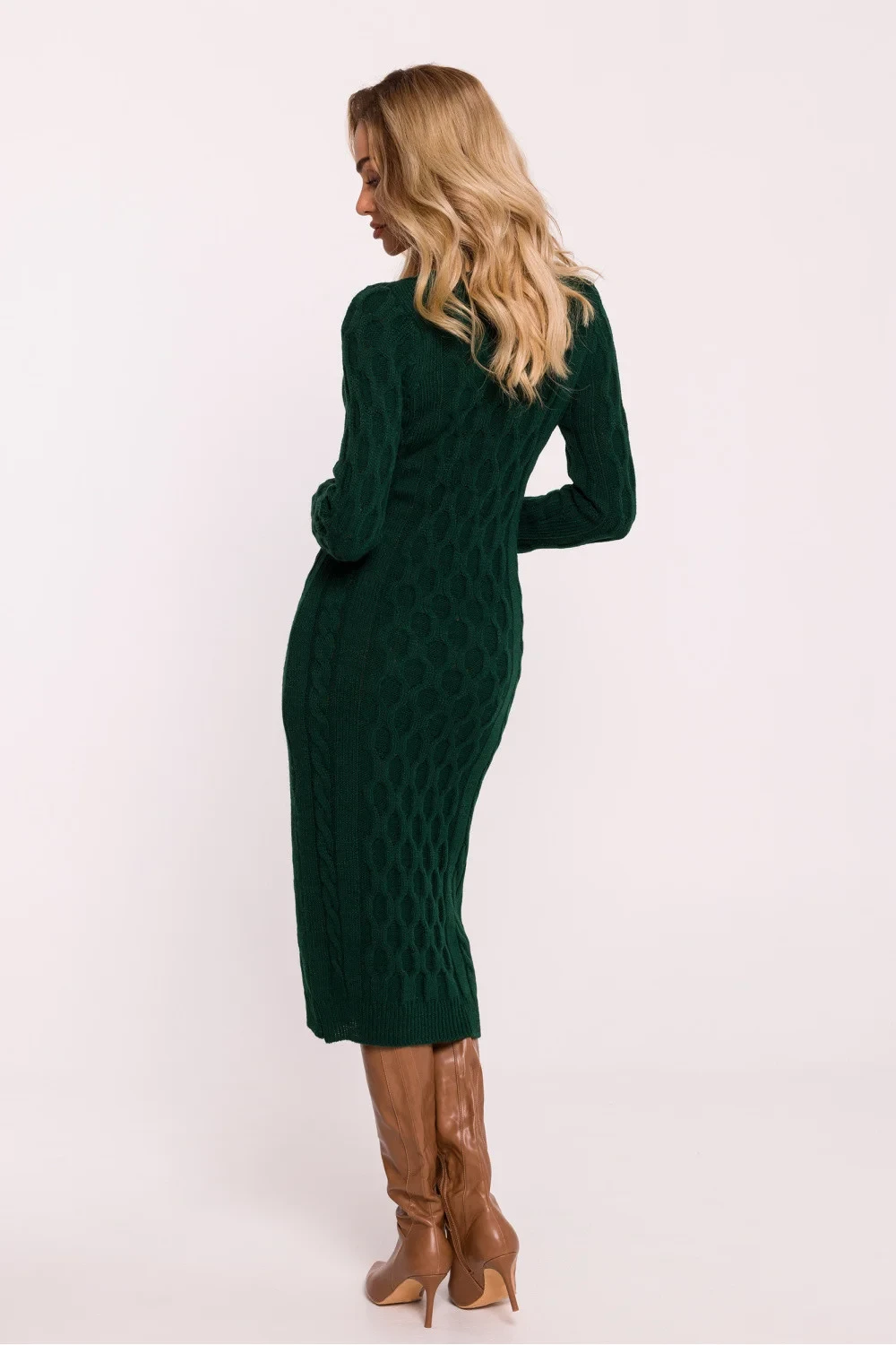 Svetrové šaty vypasovaného střihu z příze s pestrou vazbou, která jim dodává jedinečnou strukturu a měkkost. Mají dlouhé rukávy a výstřih do V, který zdůrazňuje krk a dodává mu eleganci. Midi délka nabízí pohodlí a všestrannost, ideální pro různé příležitosti. Celý kousek byl navržen a ušit v Polsku, což zaručuje vysokou kvalitu zpracování a pozornost věnovanou detailům.