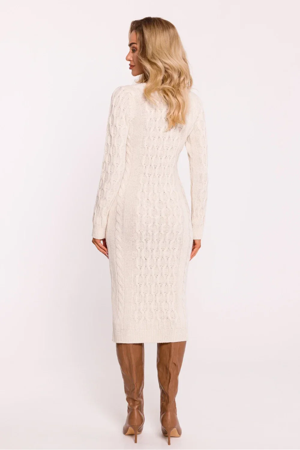 Svetrové šaty vypasovaného střihu z příze s pestrou vazbou, která jim dodává jedinečnou strukturu a měkkost. Mají dlouhé rukávy a výstřih do V, který zdůrazňuje krk a dodává mu eleganci. Midi délka nabízí pohodlí a všestrannost, ideální pro různé příležitosti. Celý kousek byl navržen a ušit v Polsku, což zaručuje vysokou kvalitu zpracování a pozornost věnovanou detailům.