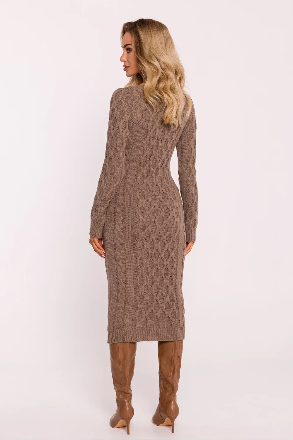 Svetrové šaty vypasovaného střihu z příze s pestrou vazbou, která jim dodává jedinečnou strukturu a měkkost. Mají dlouhé rukávy a výstřih do V, který zdůrazňuje krk a dodává mu eleganci. Midi délka nabízí pohodlí a všestrannost, ideální pro různé příležitosti. Celý kousek byl navržen a ušit v Polsku, což zaručuje vysokou kvalitu zpracování a pozornost věnovanou detailům.
