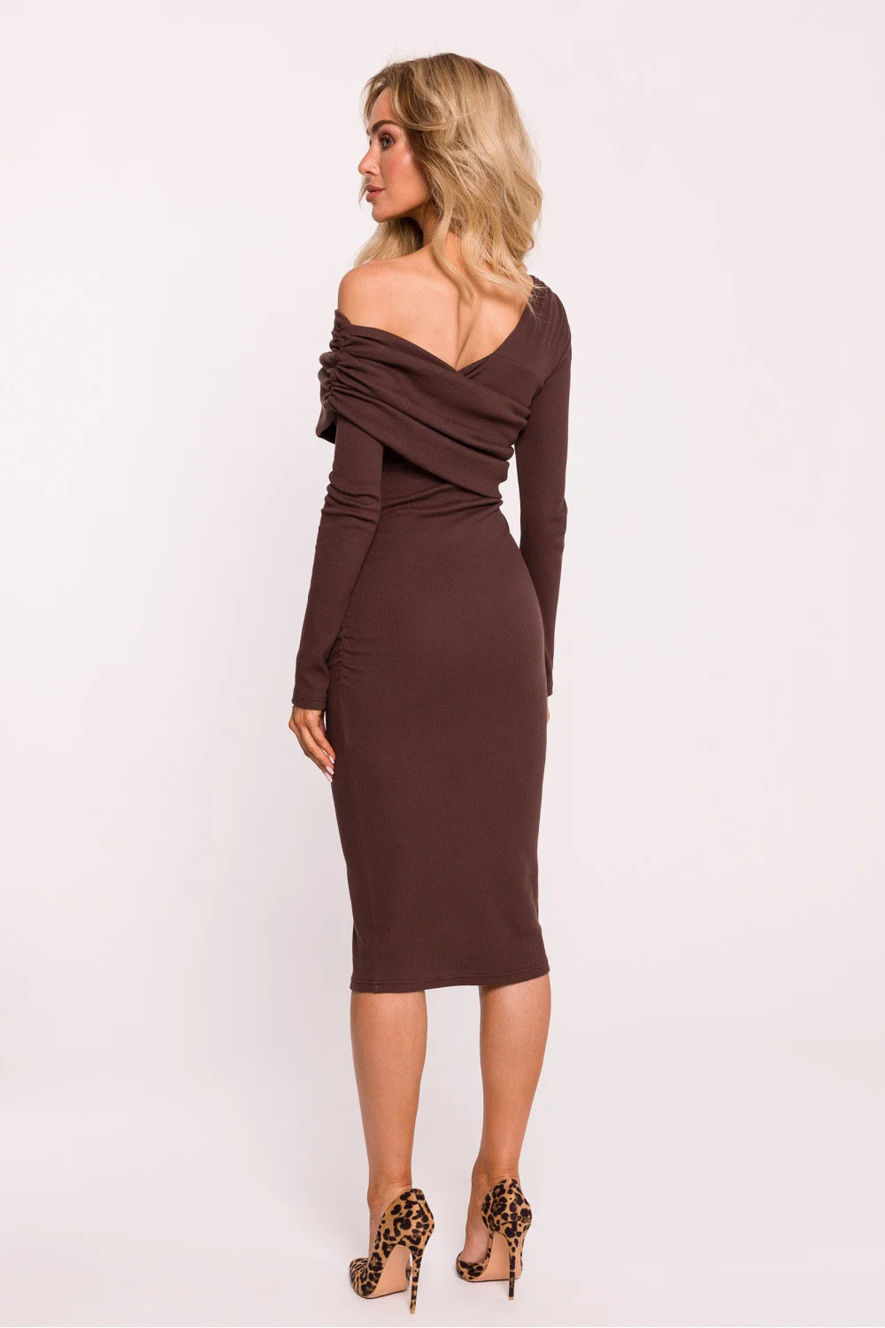 Tyto šaty s dlouhými rukávy jsou vyrobeny z žebrovaného bavlněného úpletu a mají vypasovaný střih, který jemně zvýrazňuje siluetu. Nosí se přes hlavu, jsou pohodlné a asymetrický výstřih jim dodává moderní, zajímavý charakter. Dodatečné řasení na boku dodává střihu dynamiku a eleganci a zároveň zeštíhluje siluetu. Šaty byly navrženy a ušity v Polsku, což svědčí o preciznosti výroby a nejvyšší kvalitě materiálů. Ideální pro zvláštní příležitosti i každodenní nošení.