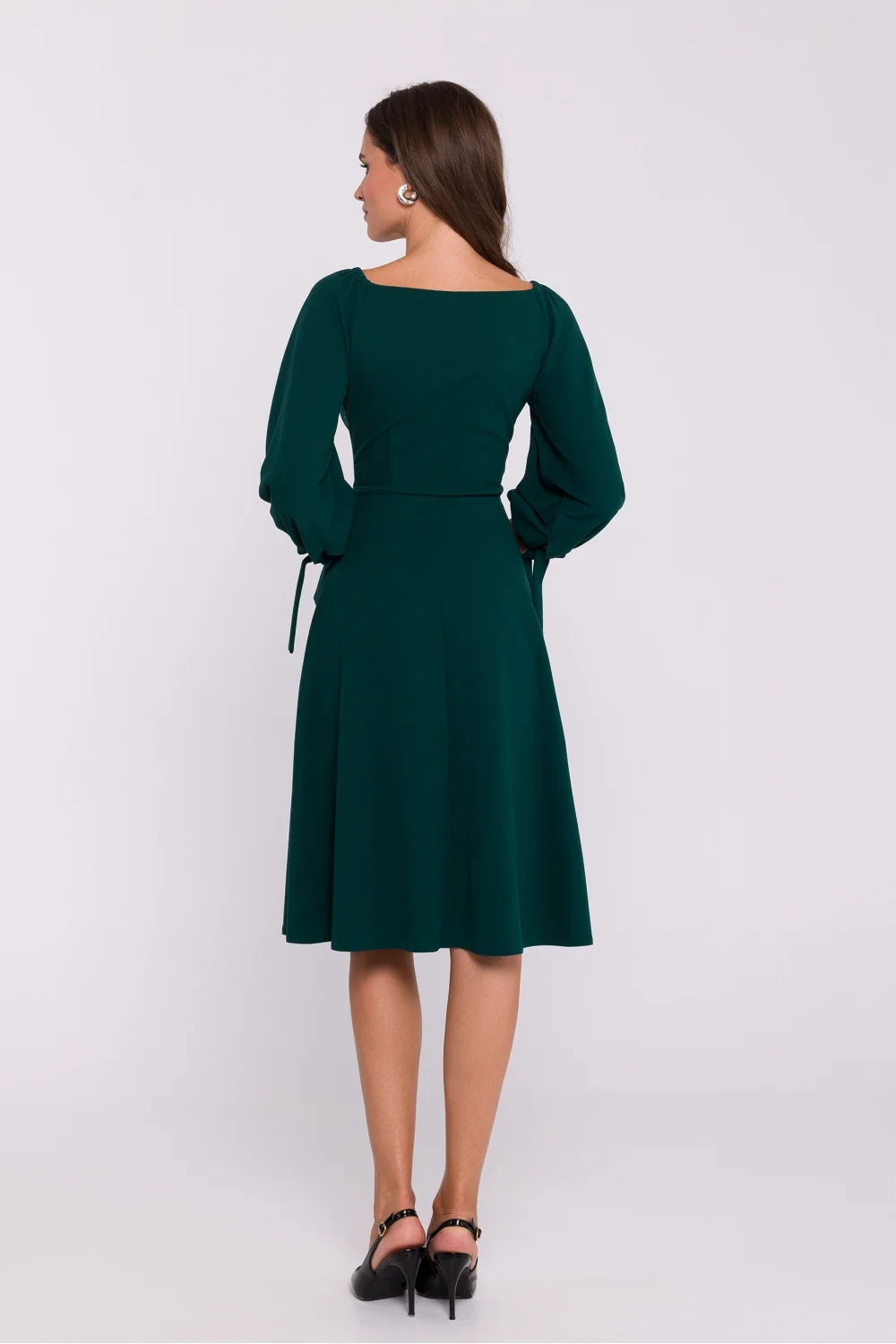 Romantické šaty z měkkého úpletu kombinují ženský styl s výjimečným pohodlím při nošení. Horní část obálkového střihu je krásně zvýrazněna výstřihem do V s možností spadnutí na ramena pro smyslný a decentní vzhled. Ramena jsou pošita elastickými vsadkami pro pohodlí a stabilitu. Nafouklé rukávy zakončené nastavitelnými vázačkami umožňují upravit délku podle vlastních preferencí. Šaty nemají žádnou podšívku, takže jsou lehké a vzdušné, a krytý zip na zádech zajišťuje estetický střih. Díky délce pod kolena jsou ideální pro různé příležitosti. Šaty byly navrženy a ušity v Polsku a zaujmou kvalitou zpracování a smyslem pro detail.