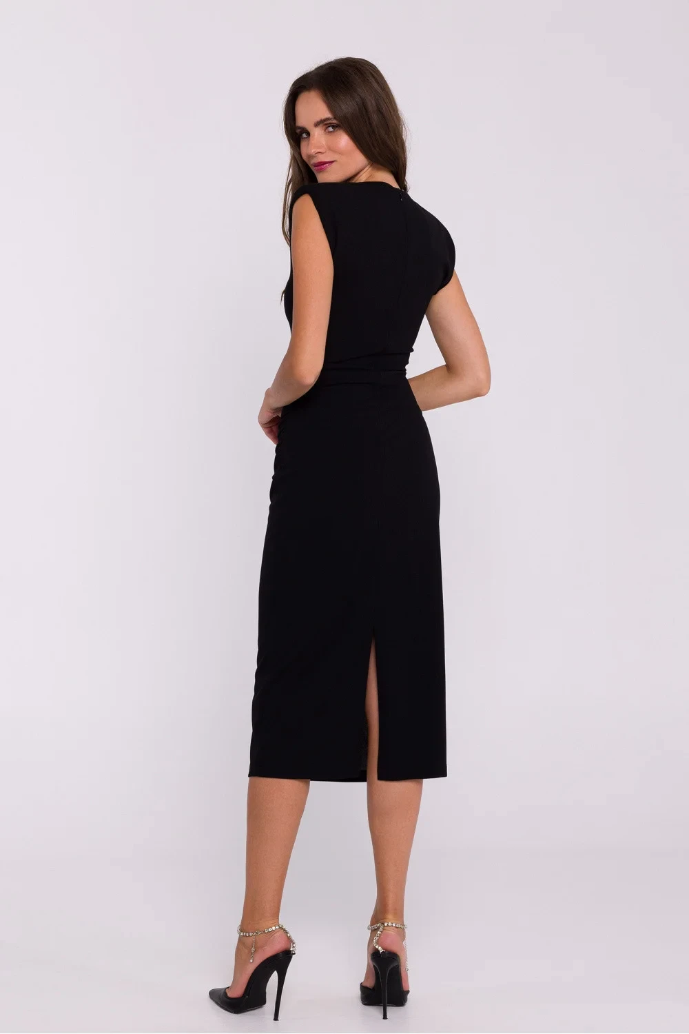 Tyto elegantní trubicové šaty z elastického úpletu jsou kvintesencí minimalismu a moderního stylu. Přiléhavý střih bez rukávů v midi délce krásně zvýrazňuje siluetu, zatímco záhyby na bocích v úrovni pasu dodávají jemnou strukturu a zeštíhlují linii těla. Na ramenou vnášejí jemné ramenní vycpávky geometrický nádech a dodávají siluetě výraznější tvar. Šaty mají na zádech krytý zip a ve spodní části diskrétní rozparek pro pohodlné nošení a volnost pohybu. Díky absenci podšívky jsou šaty lehké a pohodlné. Jsou navrženy a ušity v Polsku, což zaručuje vysokou kvalitu a precizní zpracování.