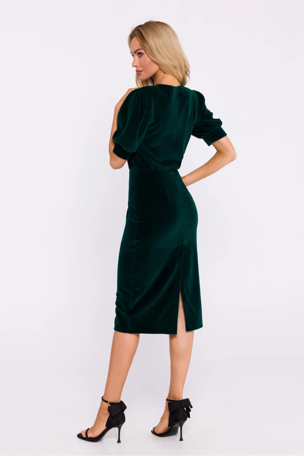 Elegantní šaty z měkkého velurového úpletu kombinují pohodlí s vytříbeným stylem. Střih v pase dokonale zvýrazňuje pas a tužková spodní část šatů sahající za kolena dodává celým šatům klasický charakter. Krátké manžetové rukávy dodávají šatům jemnou eleganci a na zádech je rozparek, který umožňuje volnost pohybu a vnáší do stylizace lehkost. Model nemá podšívku, takže je lehký a pohodlný na nošení. Šaty se zapínají na krytý zip na boku, který zajišťuje diskrétní zapínání. Šaty byly navrženy a ušity v Polsku a jsou ideální volbou pro výjimečné příležitosti, při nichž je elegance a styl na prvním místě.