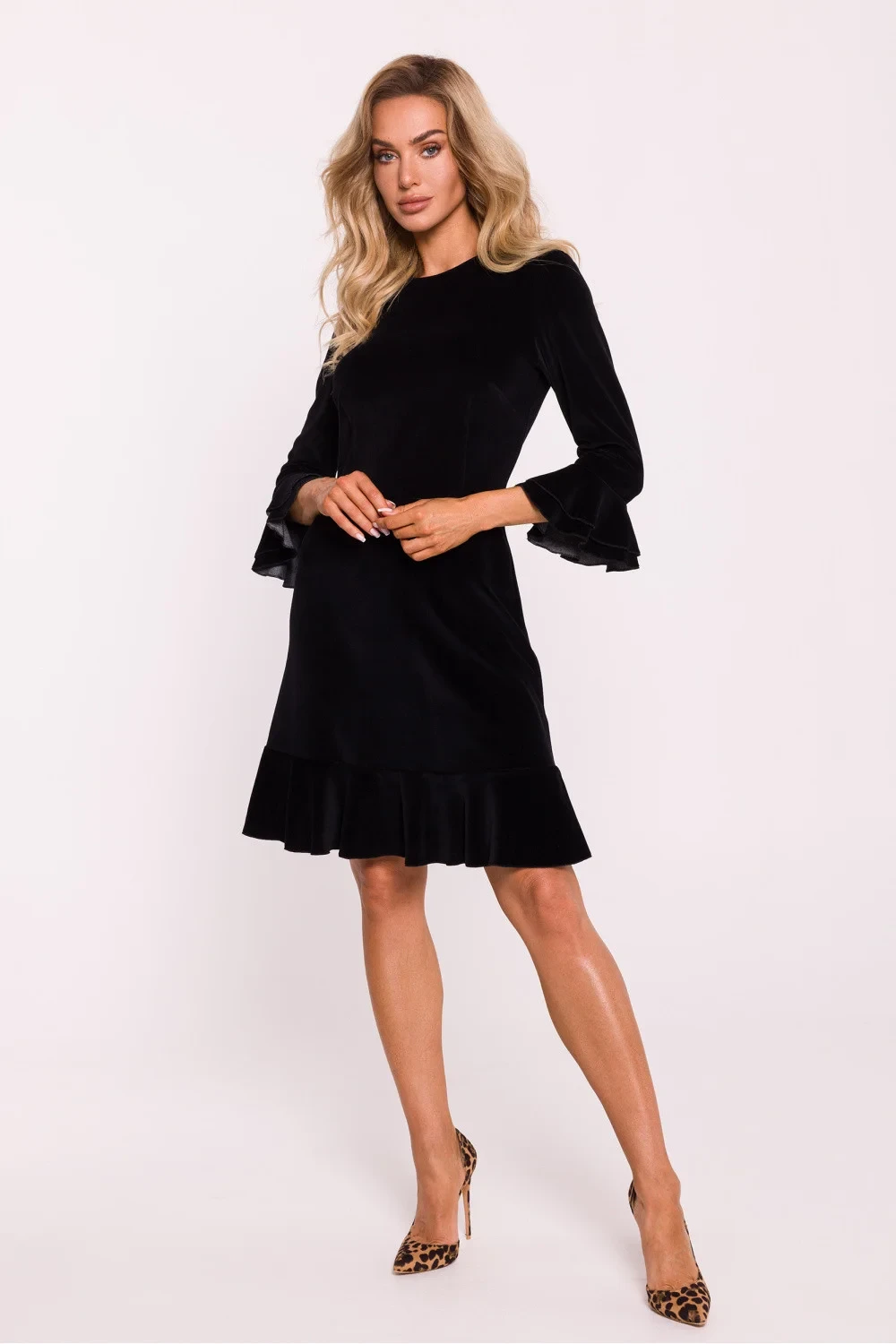 Krásné šaty z velurového úpletu, které kombinují pohodlí s elegantním stylem. Střih v pase dokonale zvýrazňuje siluetu a výstřih dodává klasický nádech. Dlouhé rukávy v délce 7/8 zakončené volánkem dodávají jemný půvab a dívčí šarm. Spodní část šatů, rovněž zakončená volánem, přináší lehkost a pohyb a délka ke kolenům je ideální pro různé příležitosti. Skrytý zip na zádech zajišťuje pohodlné zapínání a díky absenci podšívky jsou šaty lehké a pohodlné na nošení. Šaty byly navrženy a ušity v Polsku a jsou ideální volbou pro ženy, které ocení kombinaci módního vzhledu a každodenního pohodlí.
