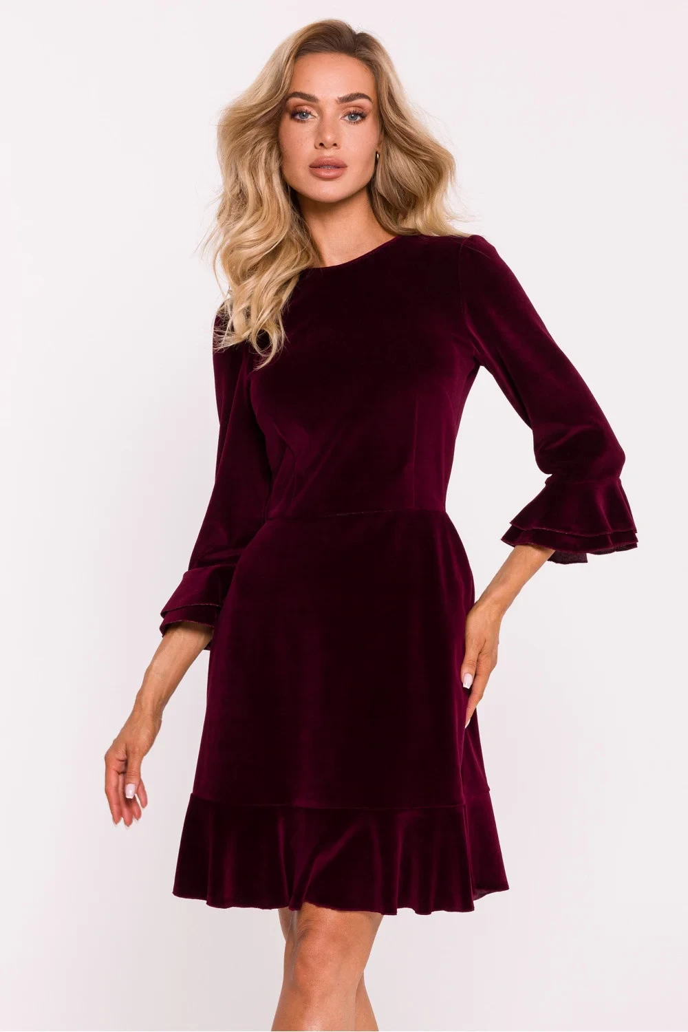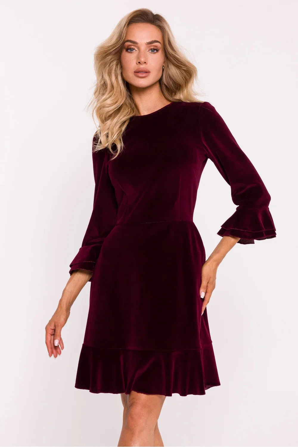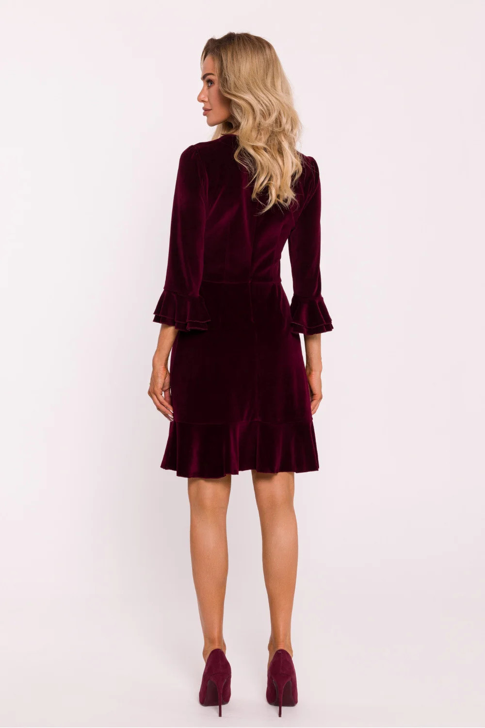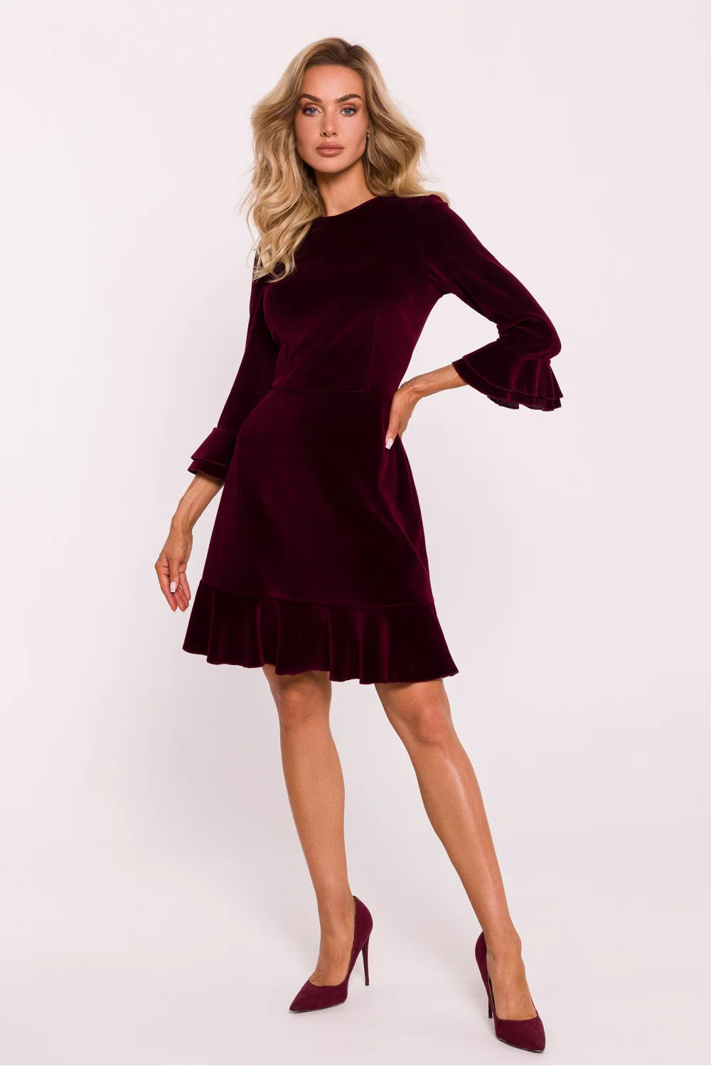 Krásné šaty z velurového úpletu, které kombinují pohodlí s elegantním stylem. Střih v pase dokonale zvýrazňuje siluetu a výstřih dodává klasický nádech. Dlouhé rukávy v délce 7/8 zakončené volánkem dodávají jemný půvab a dívčí šarm. Spodní část šatů, rovněž zakončená volánem, přináší lehkost a pohyb a délka ke kolenům je ideální pro různé příležitosti. Skrytý zip na zádech zajišťuje pohodlné zapínání a díky absenci podšívky jsou šaty lehké a pohodlné na nošení. Šaty byly navrženy a ušity v Polsku a jsou ideální volbou pro ženy, které ocení kombinaci módního vzhledu a každodenního pohodlí.