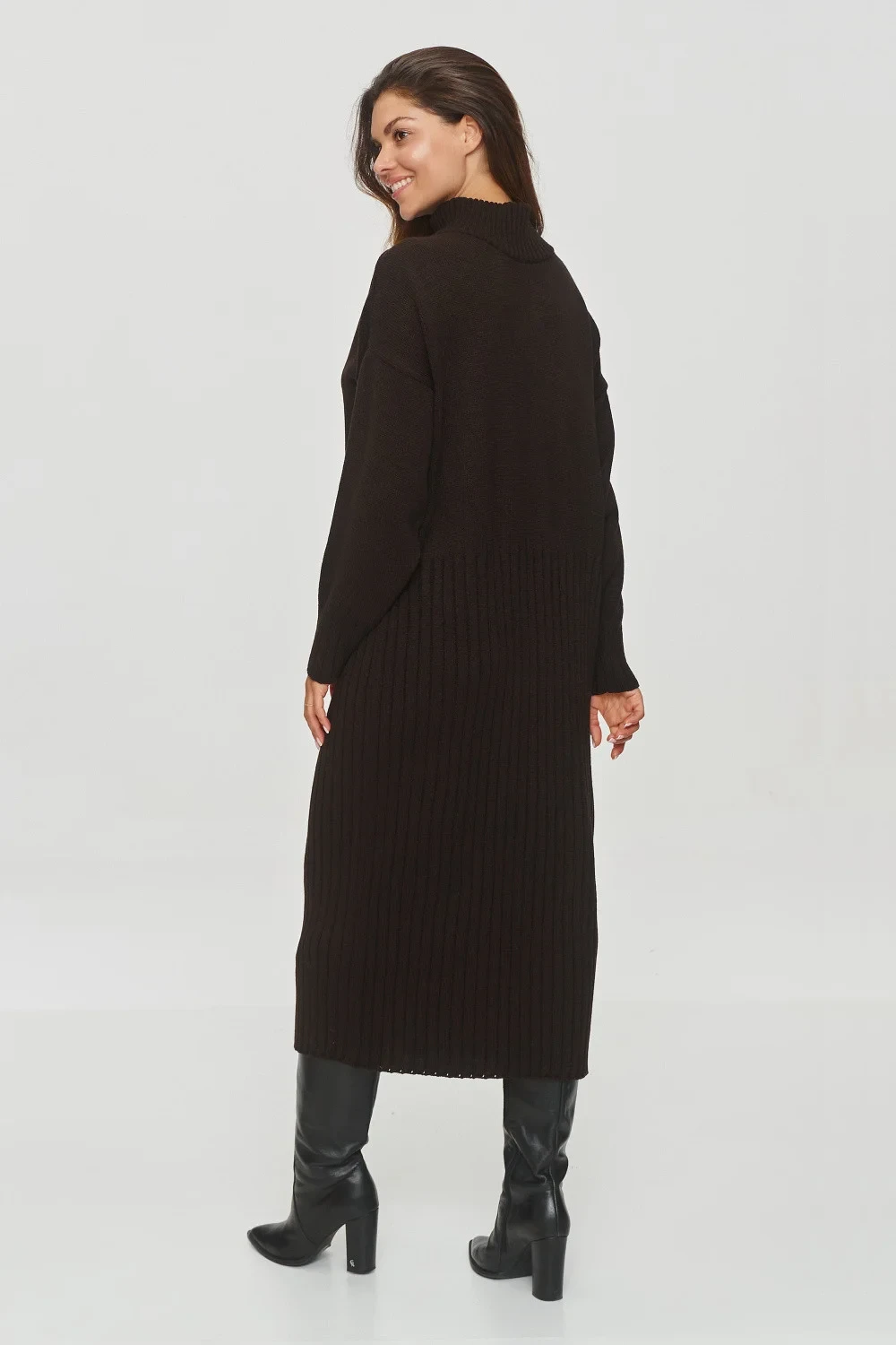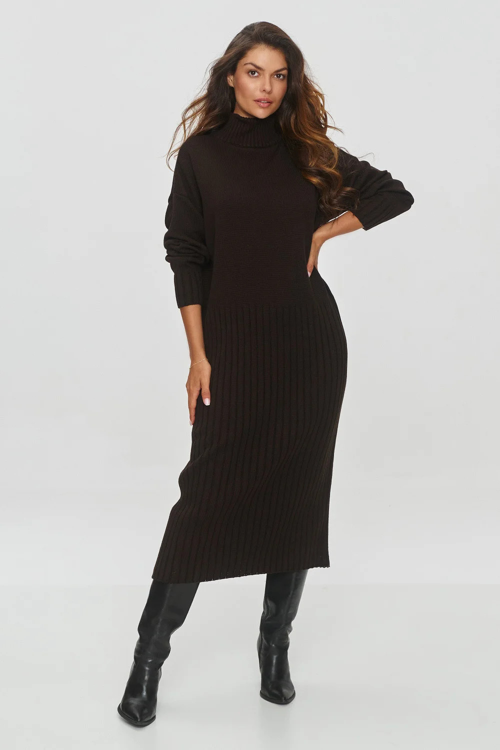 Pletené šaty s jednoduchým, elegantním střihem jsou stylovým a velmi univerzálním kouskem ideálním pro ženy, které ocení nadčasový styl. Model má délku pod kolena a spodní část šatů je vyrobena z žebrovaného úpletu, který zdůrazňuje jejich zajímavou strukturu. Horní část šatů má hladký vzor a límec je zakončen rolákem, který jim dodává hřejivý a útulný charakter, ideální pro chladnější dny. Šaty mají dlouhé, mírně vypasované rukávy, což podtrhuje jejich minimalistický a elegantní styl. Jsou ideální jak pro běžné nošení, tak pro formálnější příležitosti.