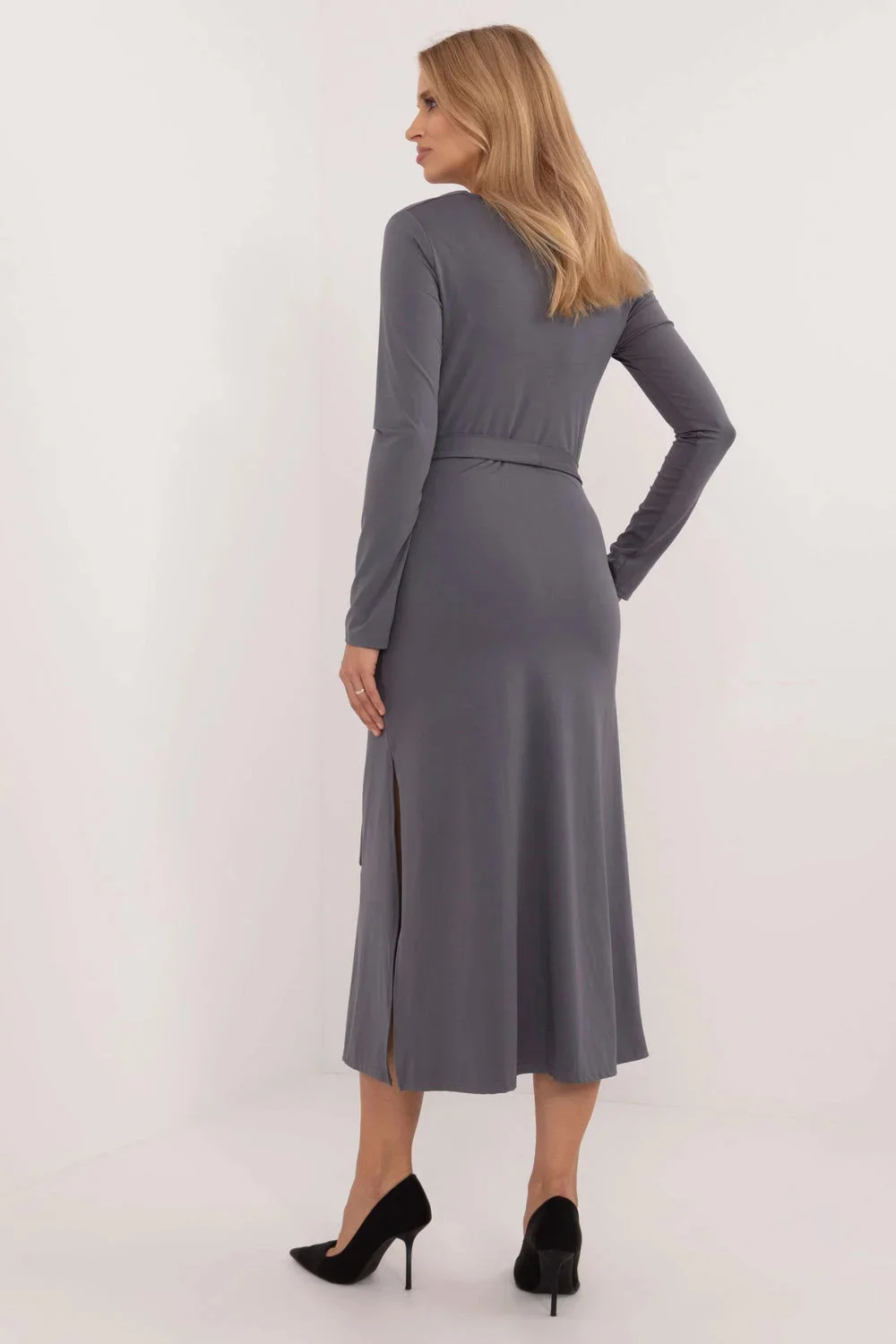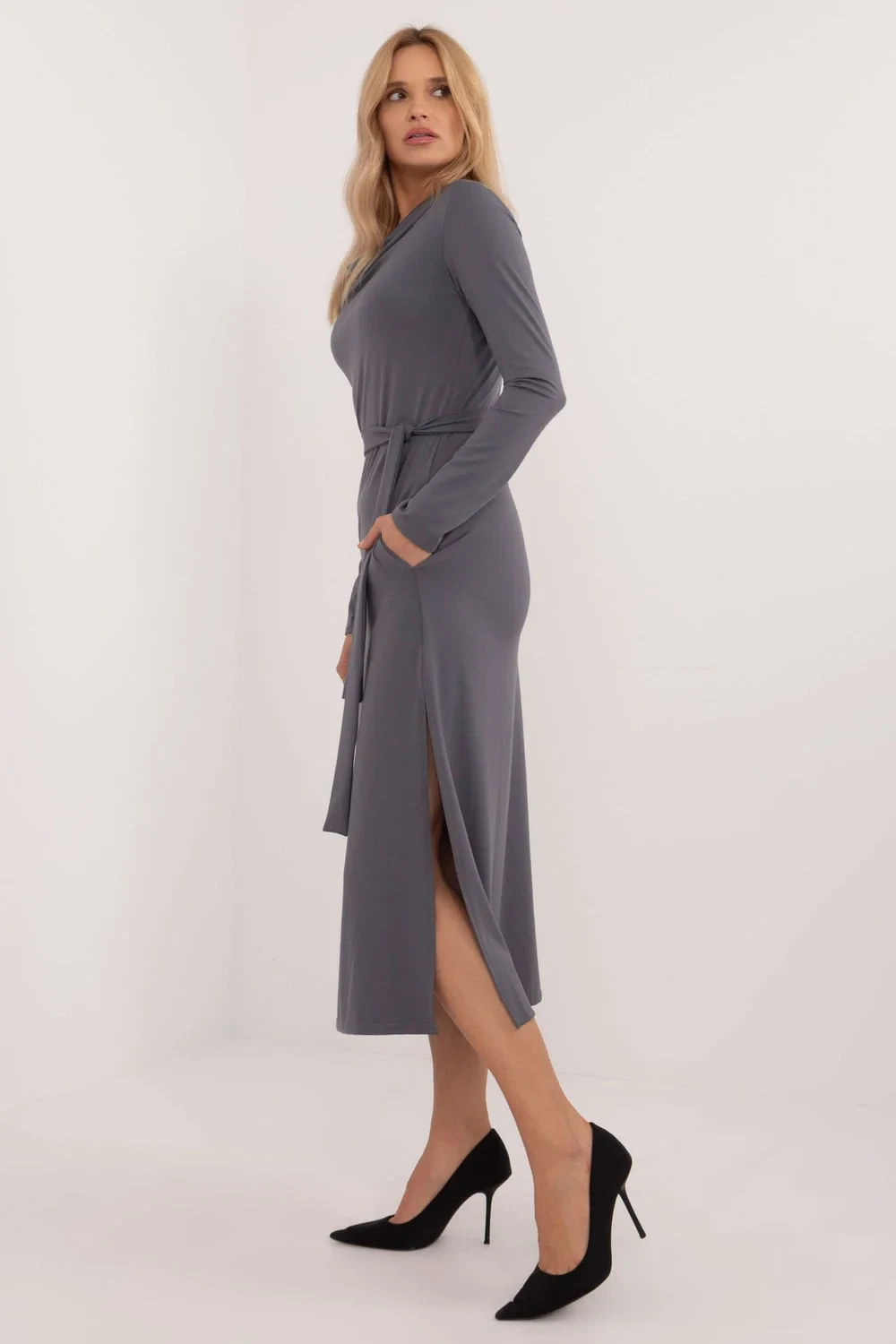 Elegantní, jednoduché šaty klasického střihu jsou ideální volbou pro slavnostní příležitosti a do práce. Jsou vyrobeny z vysoce kvalitního materiálu, který je kombinací viskózy a elastanu, poskytují pohodlí a mírně se přizpůsobí siluetě. Hladký vzor dodává šatům univerzální nádech, který se bude hodit k mnoha outfitům. Šaty sahají do poloviny lýtek a působí elegantně a profesionálně. Dlouhé rukávy a splývavý výstřih dodávají šatům jemnou ženskost a zároveň zajišťují pohodlí během nošení. Šaty nemají zapínání, což podtrhuje jejich minimalistický styl, zatímco pásek na zavázání v pase pomáhá zvýraznit siluetu. Tato elegantní a zároveň jednoduchá kreace se bude dobře hodit jak na formální vycházky, tak na každodenní profesionální styling do práce.