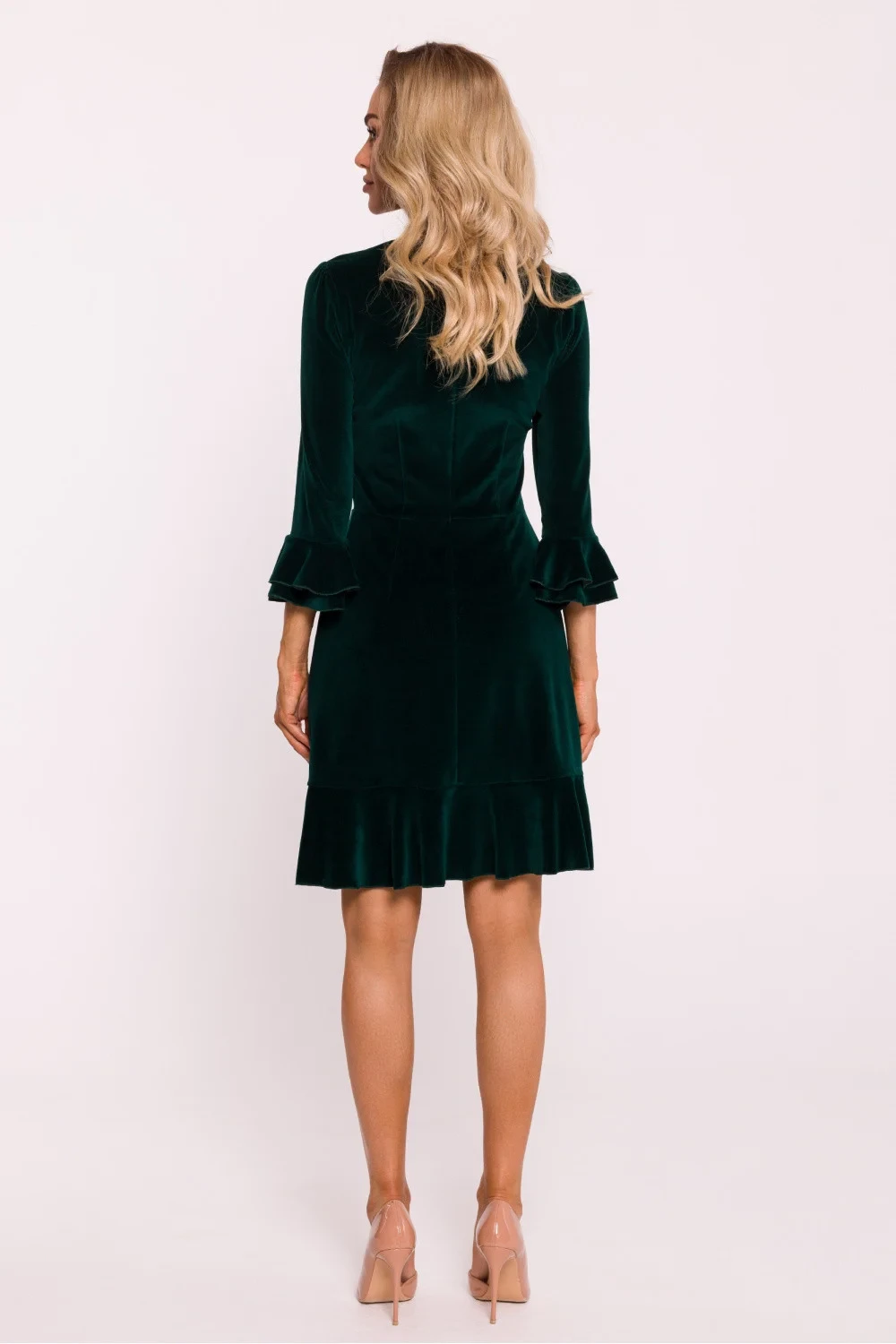 Krásné šaty z velurového úpletu, které kombinují pohodlí s elegantním stylem. Střih v pase dokonale zvýrazňuje siluetu a výstřih dodává klasický nádech. Dlouhé rukávy v délce 7/8 zakončené volánkem dodávají jemný půvab a dívčí šarm. Spodní část šatů, rovněž zakončená volánem, přináší lehkost a pohyb a délka ke kolenům je ideální pro různé příležitosti. Skrytý zip na zádech zajišťuje pohodlné zapínání a díky absenci podšívky jsou šaty lehké a pohodlné na nošení. Šaty byly navrženy a ušity v Polsku a jsou ideální volbou pro ženy, které ocení kombinaci módního vzhledu a každodenního pohodlí.