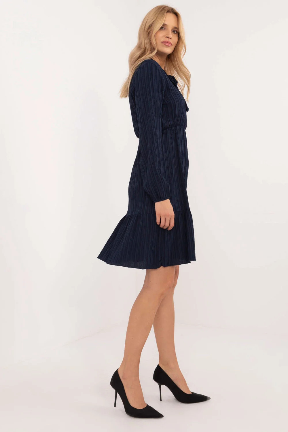 Každodenní šaty s rozkročeným střihem, ideální jak do práce, tak i na běžné nošení. Vyrobena z směsi polyesteru a elastanu, nabízí pohodlí a volnost pohybu, a zároveň elegantní vzhled. Různorodá textura materiálu jí dodává originalitu a přitahuje pohled jemným detailu. Šaty sahají před koleno, co je činí ženskými a univerzálními. Dole ozdobené volánem dodávají lehkost a pohyb stylizaci. Šněrovací výstřih a dlouhé rukávy jí dodávají stylový a pohodlný charakter, ideální na různé každodenní příležitosti.