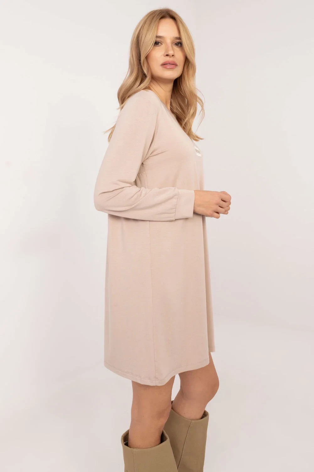 Každodenní šaty z mikro modálu, ideální pro každý den, poskytují komfort a styl. Vyrobená z měkkého a prodyšného materiálu mikro modál, jemně se přizpůsobuje postavě, což zaručuje pohodlí při nošení. Šaty mají délku před koleno a rozkročený střih, který jim dodává lehkost a ženskou eleganci. Dlouhý rukáv a kulatý výstřih vytvářejí klasický, minimalistický vzhled a hladký vzor zdůrazňuje jejich univerzální charakter. Bez zapínání poskytují volnost oblékání a dodatečné nášivky na přední straně přidávají módní, originální akcent. Ideální pro každodenní outfity.