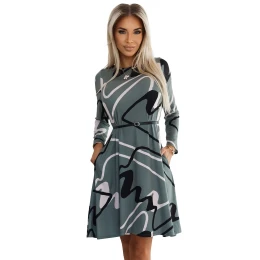Trapezové šaty značky Numoco jsou pohodlným návrhem na chladné dny. Vyrobena z teplého materiálu v olivově-černo-béžovém vzoru, skvěle se hodí do každodenních stylizací. Šaty mají dlouhý rukáv, kapsy na sukní a černý pásek, který lze volitelně nosit k podtržení pasu. Polský výrobek s volným, moderním střihem.