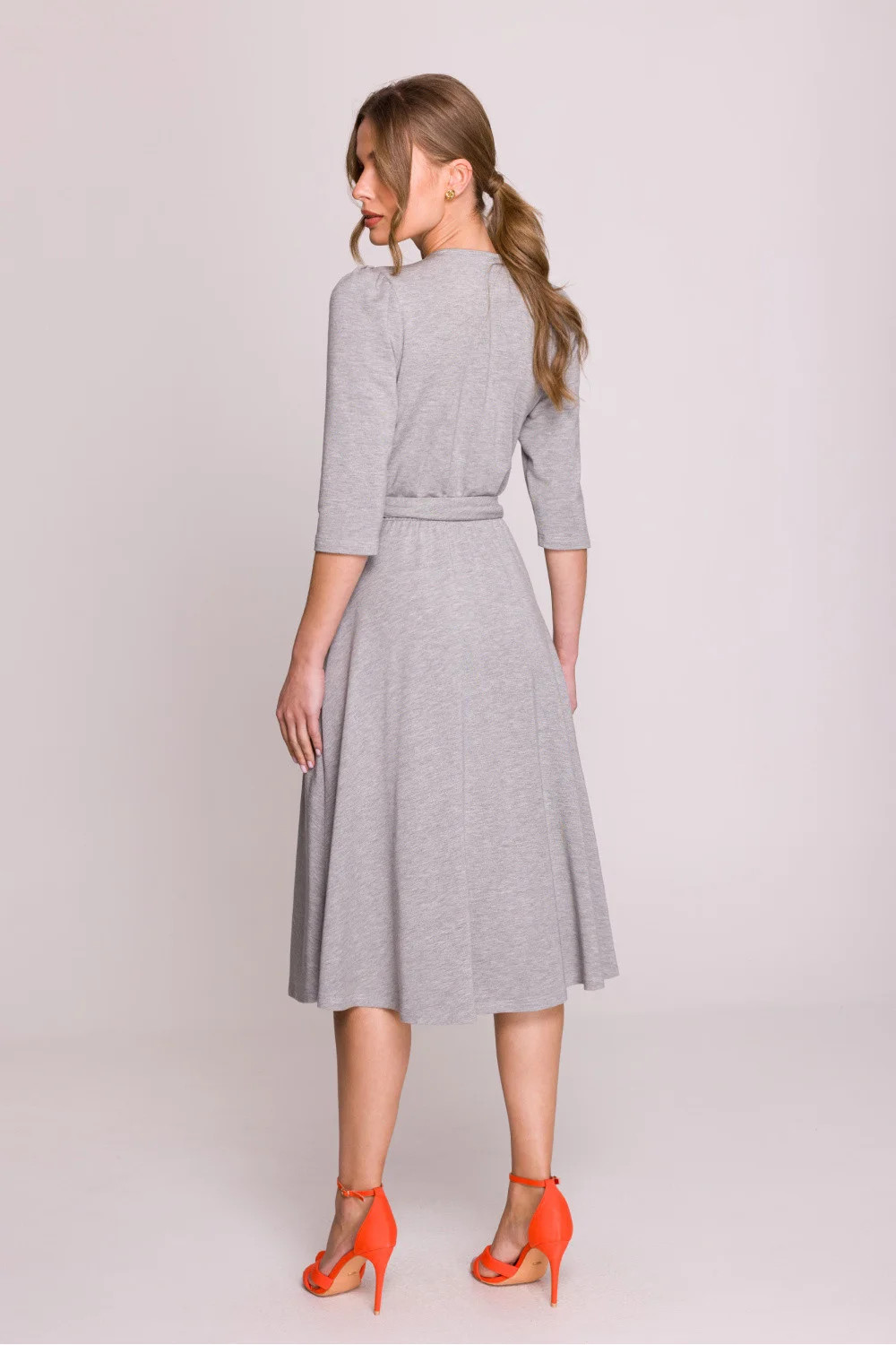 Elegantní a pohodlné šaty z modální látky, které skvěle kombinují pohodlí s ženským stylem. Model s přiléhavým vrškem a výstřihem ve tvaru písmene V jemně zdůrazňuje postavu, a pásek v pase umožňuje ideální přizpůsobení postavě. Lehce rozšířený spodek dodává šatům lehkost a volnost pohybu. Klasická délka po kolena a 3/4 rukávy ji dělají univerzální volbou na různé příležitosti. Šaty se oblékají přes hlavu, bez zbytečných zapínání, což zajišťuje pohodlí nošení. Navrženo a ušito v Polsku z nejkvalitnější měkké modální látky, která je prodyšná a příjemná k pokožce.