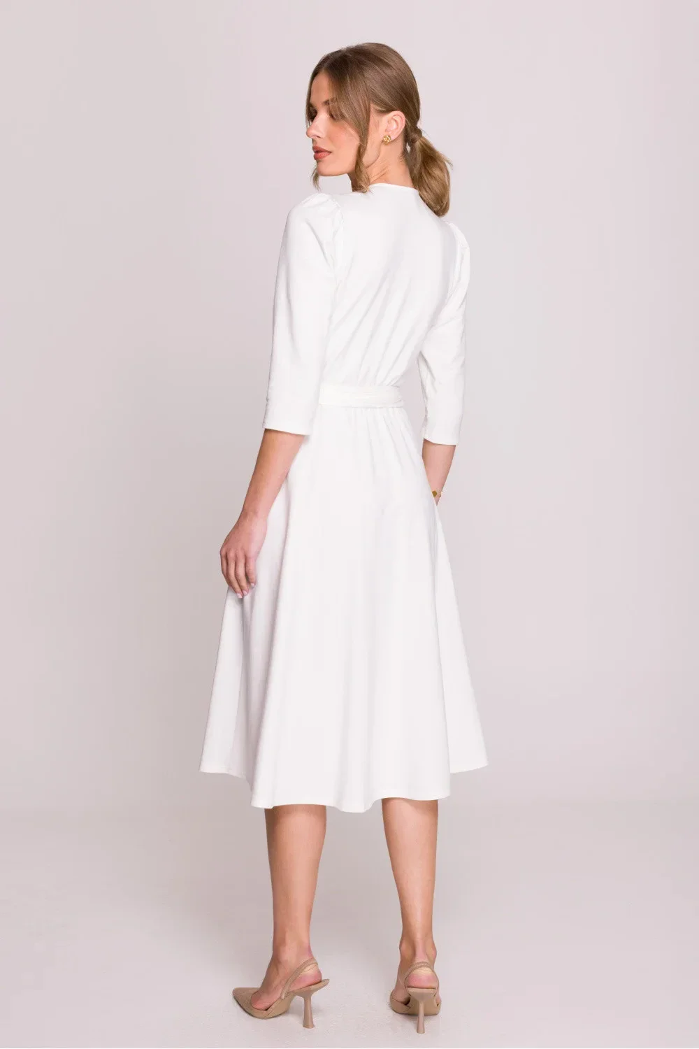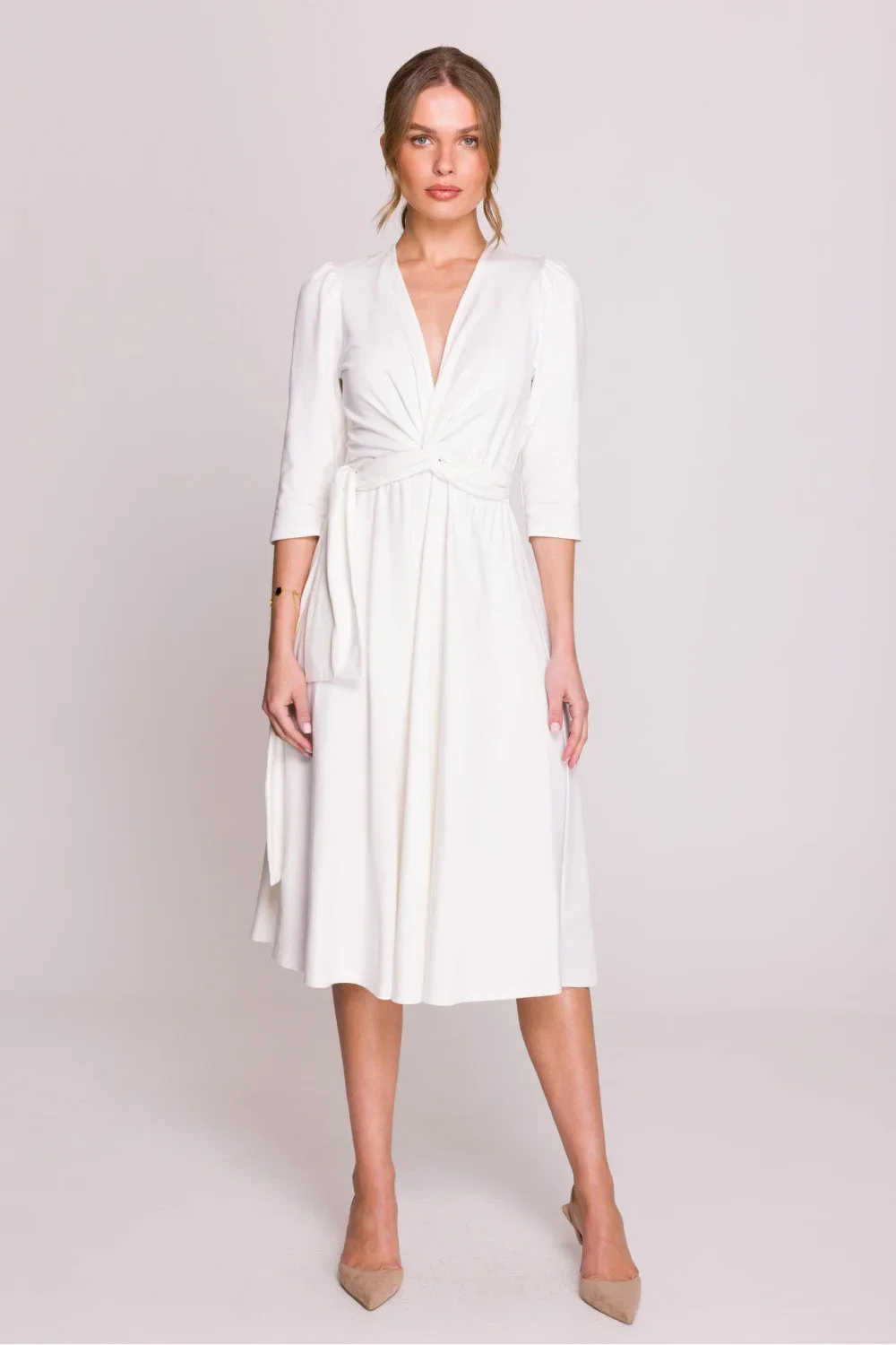 Elegantní a pohodlné šaty z modální látky, které skvěle kombinují pohodlí s ženským stylem. Model s přizpůsobeným vrchním dílem a výstřihem ve tvaru písmene V jemně zdůrazňuje siluetu, a šněrování v pasu umožňuje ideální přizpůsobení postavě. Lehce rozšířený spodek dodává šatům lehkost a volnost pohybu. Klasická délka po kolena a 3/4 rukávy je dělají univerzální volbou na různé příležitosti. Šaty se oblékají přes hlavu, bez zbytečných zapínání, co zajišťuje pohodlné nošení. Navrženo a ušito v Polsku z vysoce kvalitní modální látky měkké, prodyšné a příjemné k pokožce.