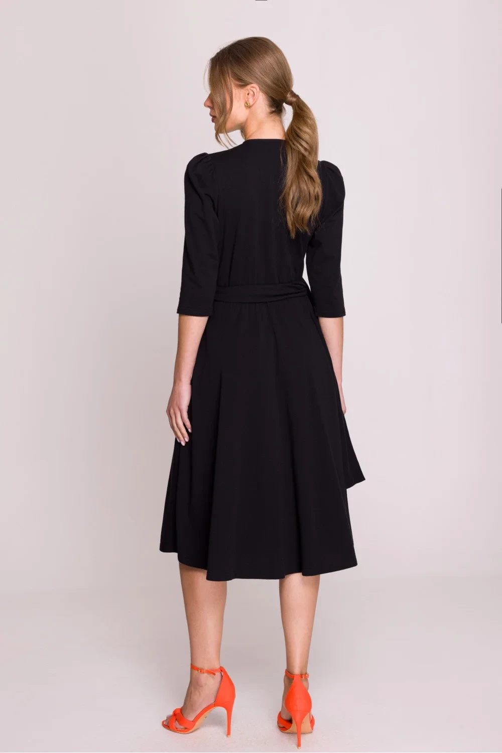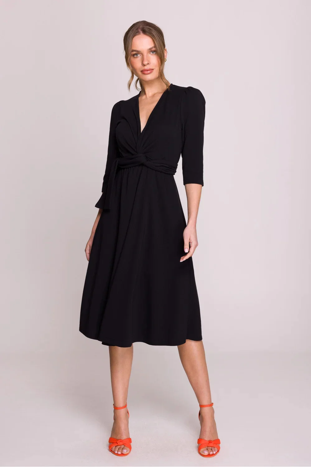 Elegantní a pohodlné šaty z modálního pletiva, které skvěle kombinují pohodlí s ženským stylem. Model s přiléhavým vrškem a výstřihem ve tvaru písmene V jemně zdůrazňuje postavu, a šněrování v pasu umožňuje perfektní přizpůsobení postavě. Lehce rozkročený spodek dodává šatům lehkost a volnost pohybu. Klasická délka po kolena a 3/4 rukávy ji činí univerzální volbou na různé příležitosti. Šaty se oblékají přes hlavu, bez zbytečných zapínání, co zajišťuje pohodlí nošení. Navrženo a ušito v Polsku, z nejkvalitnější modální pletiva měkké, prodyšné a příjemné k pokožce.