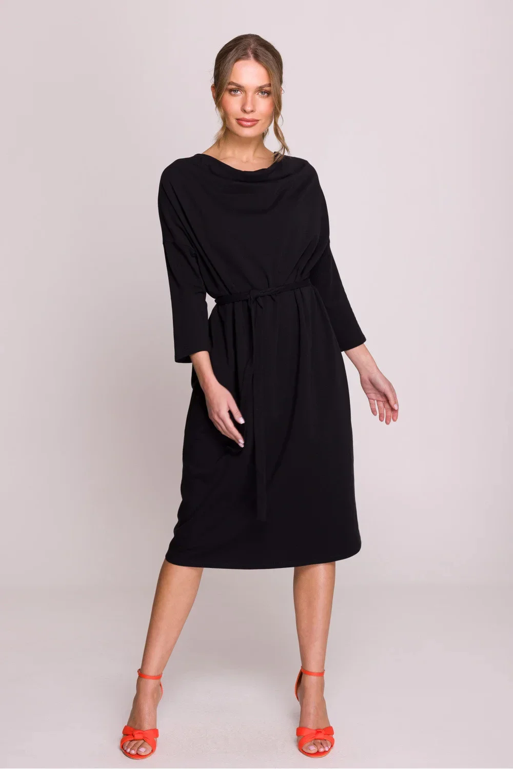Elegantní šaty ve stylu oversize, vyrobené z vysoce kvalitní modální pleteniny, která je měkká, prodyšná a velmi příjemná na pokožku. Volný střih zajišťuje pohodlné nošení a přiložený pás umožňuje zdůraznit pas podle vlastních preferencí. Vodní výstřih dodává kreaci elegantní charakter, jemně se skládající kolem krku. Šaty mají délku nad kolena a 3/4 rukávy, co z nich činí univerzální volbu jak na každý den, tak na speciální příležitosti. Model se obléká přes hlavu, bez zbytečných zapínání. Navrženo a ušito v Polsku s důrazem na každý detail.