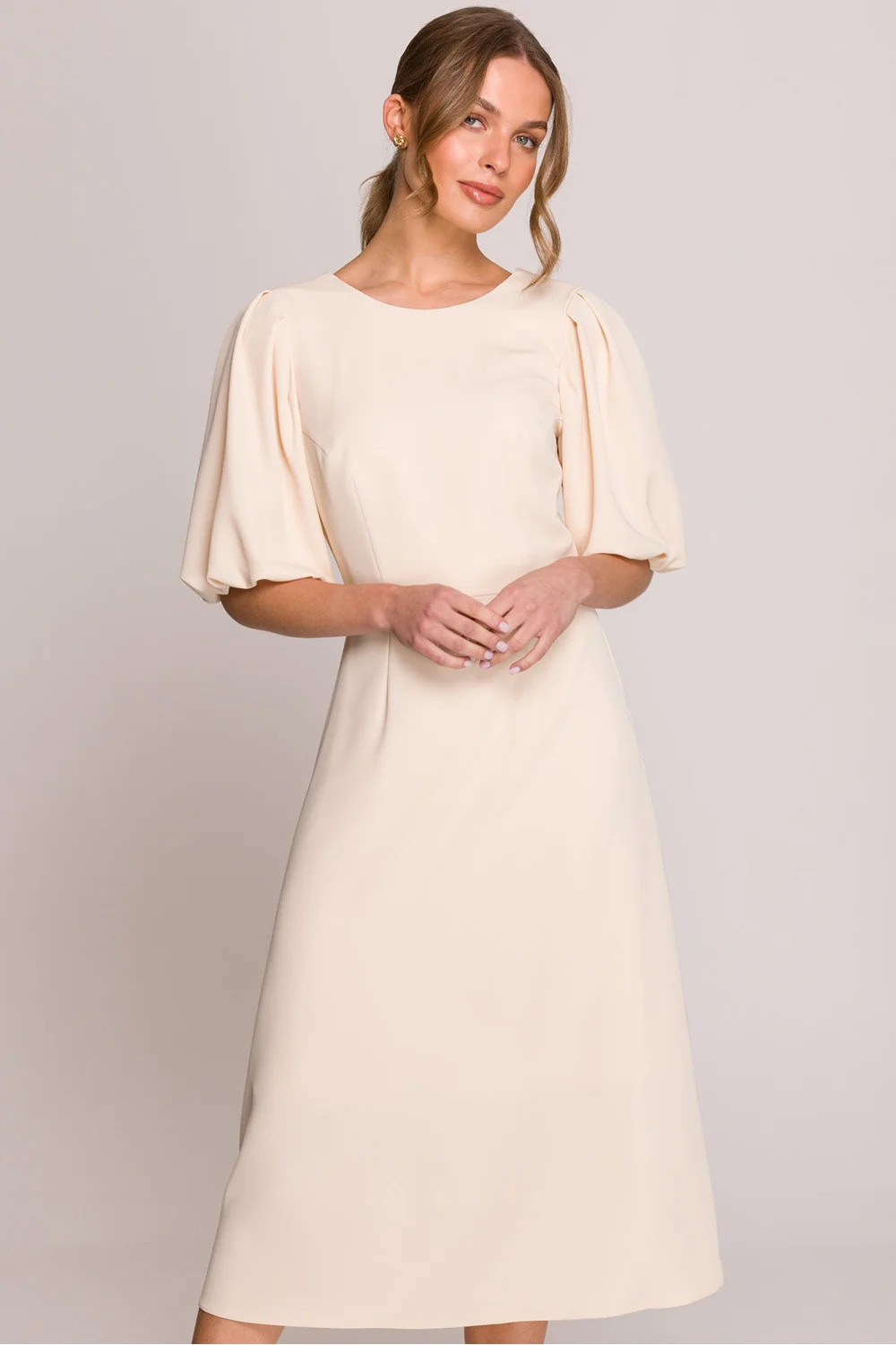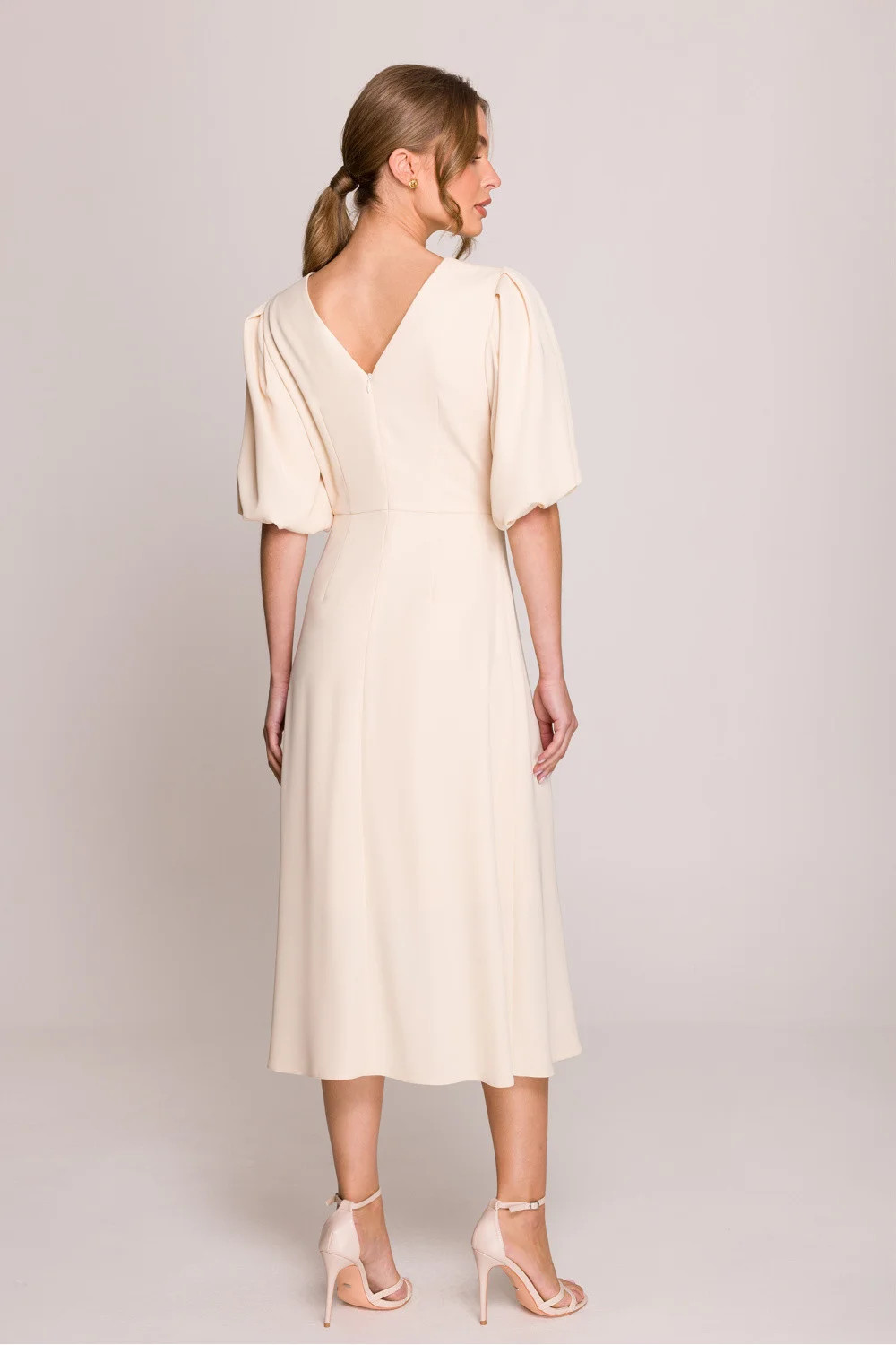 Romantické a ženské midi šaty s lehce rozklosovaným střihem, který se krásně pohybuje. Klasický kulatý výstřih vpředu a jemné výstřihy ve tvaru písmene V vzadu dodávají eleganci. Krátké nafouklé rukávy na podšívce dávají šatům jemný, stylový charakter. Horní část je také podšita, co zaručuje pohodlí nošení a ideální přizpůsobení. Model se zapíná na skrytý zip vzadu, díky čemuž vypadá celkově neobyčejně esteticky. Šaty byly navrženy a ušity v Polsku s důrazem na každý detail. Ideální na speciální příležitosti, stejně jako na každodenní nošení v plném stylu.