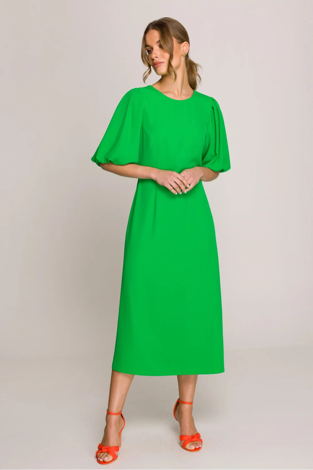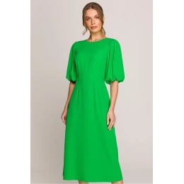 Romantické a ženské midi šaty s lehce rozklosovaným střihem, který se krásně pohybuje. Klasický kulatý výstřih vpředu a jemné výstřihy ve tvaru písmene V vzadu dodávají eleganci. Krátké nafouklé rukávy na podšívce dodávají šatům jemný, stylový charakter. Horní část je také podšita, co zajišťuje pohodlí a ideální přizpůsobení. Model se zapíná na skrytý zip vzadu, díky čemuž vypadá celkově velmi esteticky. Šaty navrženy a ušity v Polsku s důrazem na každý detail. Ideální na speciální příležitosti i na každodenní nošení plné elegance.