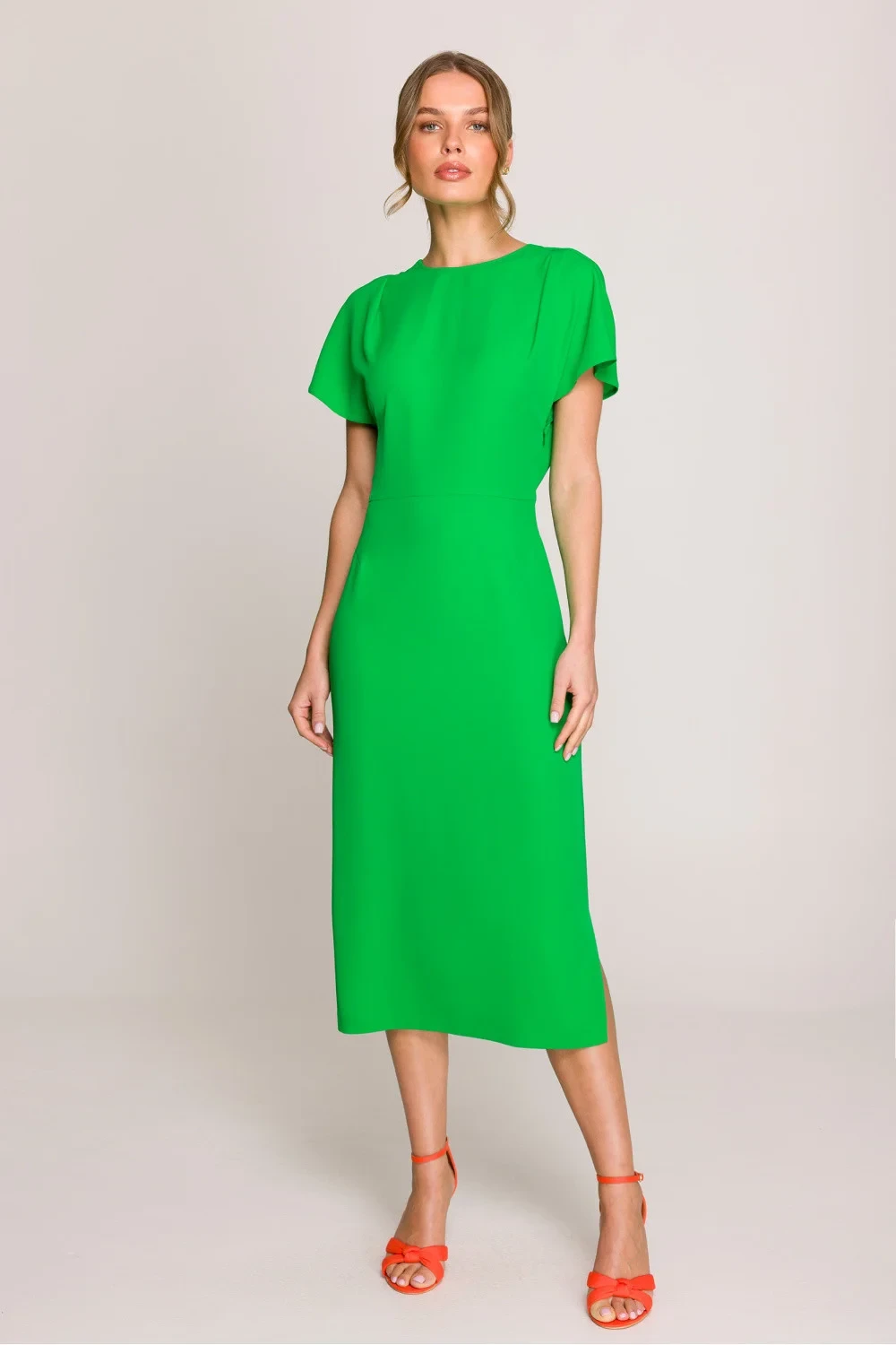 Elegantní a ženské midi šaty s přiléhavým střihem, který zdůrazňuje siluetu. Zastřešený vrch dodává šaty klasický charakter, zatímco hluboký výstřih ve tvaru písmene V na zádech přidává jemnou smyslnost. Krátké rukávy zajistí pohodlí a univerzálnost na různé příležitosti. Šaty se zapínají na skrytý zip na straně, díky čemuž se skvěle přizpůsobují postavě. Rozpark na straně přidává lehkost a volnost pohybu. Model navržený a ušitý v Polsku s důrazem na detaily a vysokou kvalitu zpracování. Ideální na elegantní výstupy, večírky a speciální příležitosti.