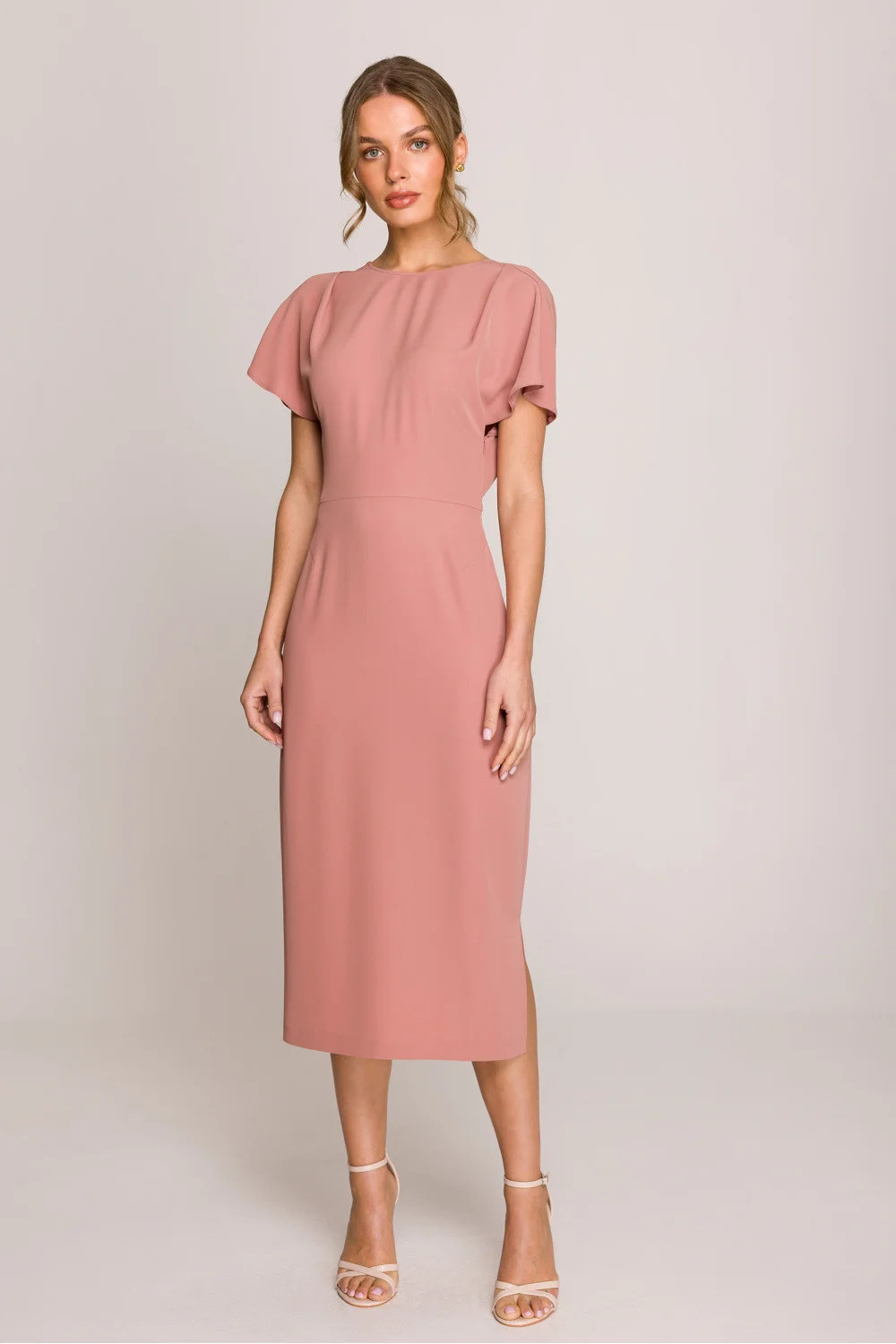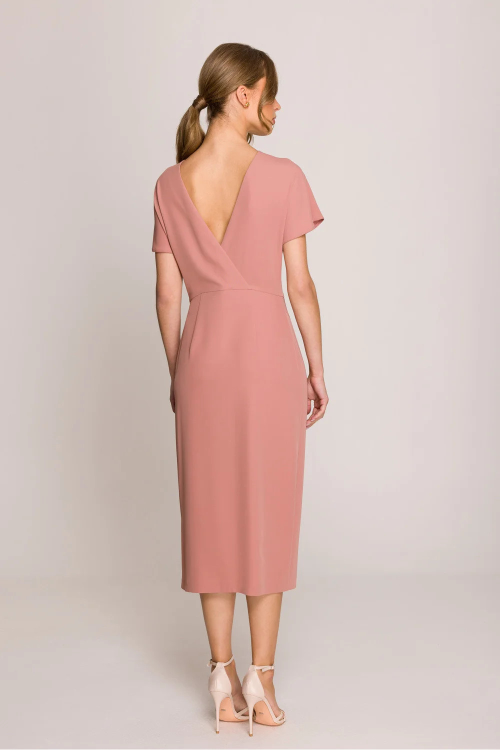 Elegantní a ženské midi šaty s přiléhavým střihem, který zdůrazňuje postavu. Zabudovaný vrch dodává klasický charakter, zatímco hluboký výstřih ve tvaru písmene V na zádech přidává jemnou smyslnost. Krátké rukávy zajistí pohodlí a všestrannost na různé příležitosti. Šaty se zapínají na skrytý zip na boku, díky čemuž se skvěle přizpůsobují tělu. Rozpark na boku dodává lehkost a volnost pohybu. Model navržen a ušit v Polsku s důrazem na detaily a vysokou kvalitu zpracování. Ideální na elegantní výstupy, večírky a speciální příležitosti.