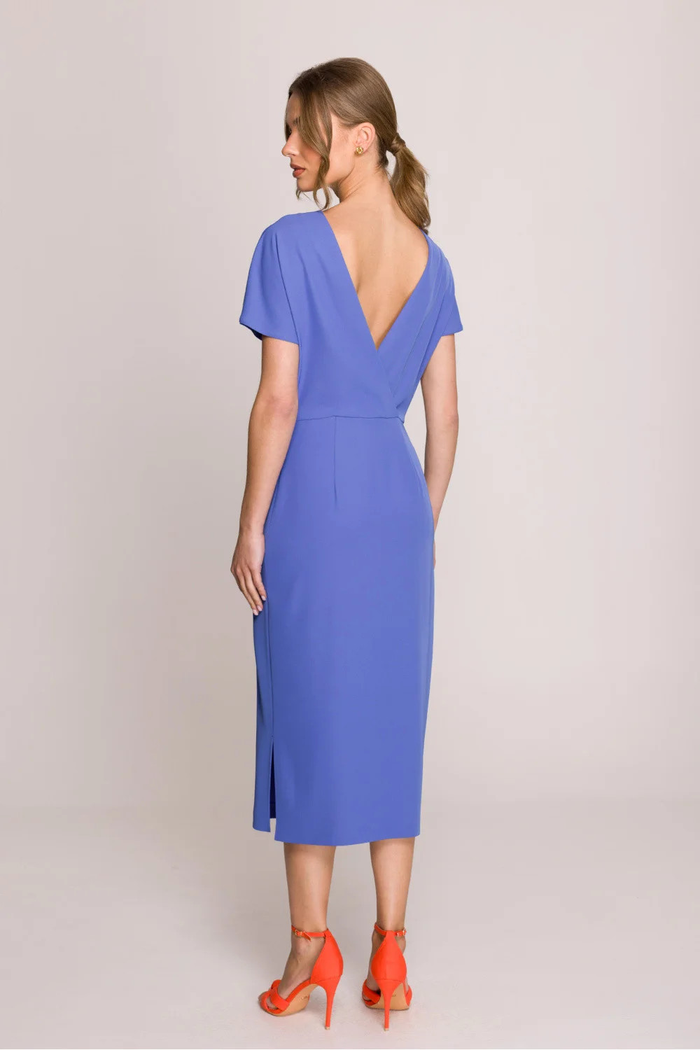 Elegantní a ženské šaty midi s přiléhavým střihem, který zdůrazňuje postavu. Zastřešený vrch jí dodává klasický charakter a hluboký výstřih ve tvaru písmene V na zádech přidává jemnou smyslnost. Krátké rukávy zajišťují pohodlí a univerzálnost pro různé příležitosti. Šaty se zapínají na skrytý zip po stranách, díky čemuž se skvěle přizpůsobují tělu. Rozpark na boku přidává lehkost a volnost pohybu. Model navržený a ušitý v Polsku s důrazem na detaily a vysokou kvalitu zpracování. Ideální na elegantní večírky, recepce a speciální příležitosti.