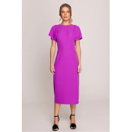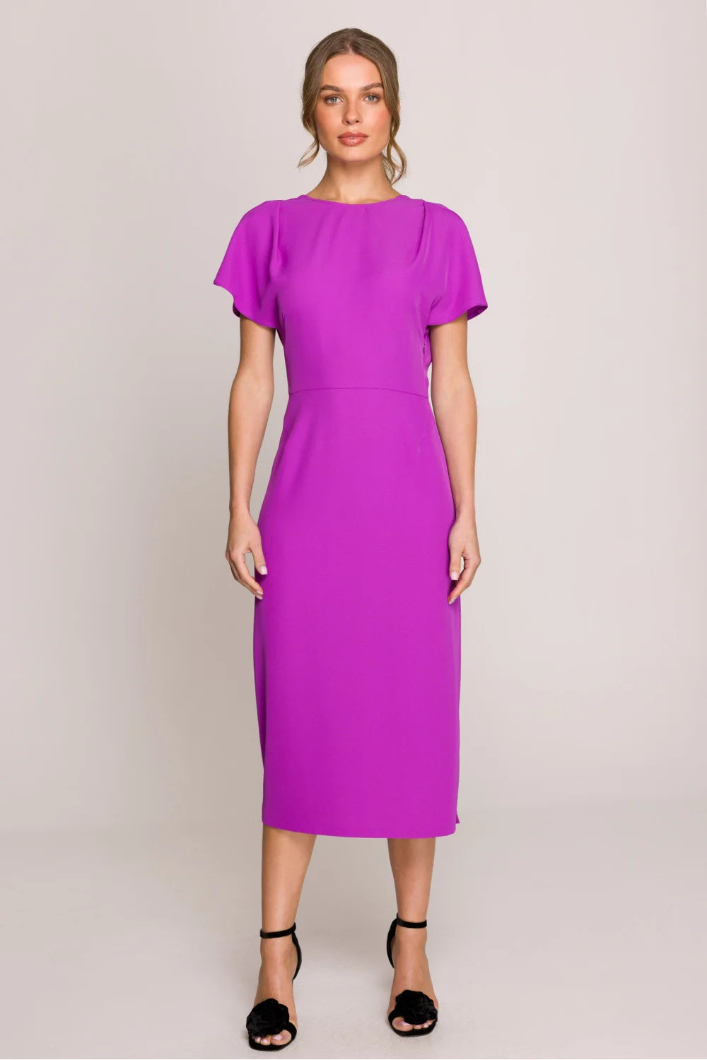Elegantní a ženské šaty midi s přiléhavým střihem, který zdůrazňuje postavu. Zastřešená horní část dodává klasický charakter, zatímco hluboký výstřih ve tvaru písmene V na zádech přidává jemnou smyslnost. Krátké rukávy zajistí pohodlí a univerzálnost pro různé příležitosti. Šaty se zapínají na skrytý zip po straně, díky čemuž se skvěle přizpůsobí tělu. Rozpark na straně dodává lehkost a volnost pohybu. Model navržen a ušit v Polsku s důrazem na detaily a vysokou kvalitu zpracování. Ideální na elegantní výstupy, večírky a speciální události.