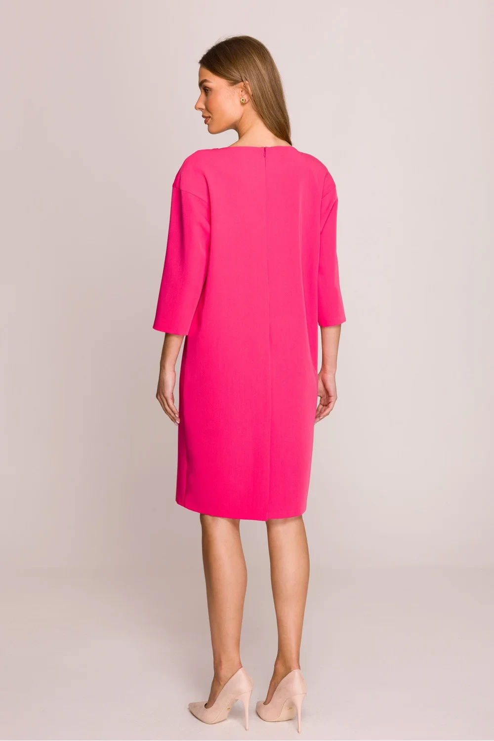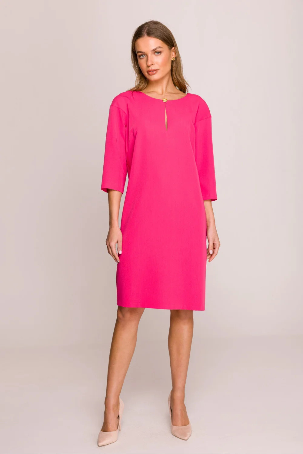 Volná a pohodlná šaty s volným střihem sahající před koleno. Mají rukávy délky 3/4 a výstřih s jemným průstřihem ozdobený elegantním knoflíkem. Na zádech se zapínají na skrytý zip a dole mají jemný rozpark, který poskytuje větší volnost pohybu. Model bez podšívky, ideální na různé příležitosti. Šaty byly navrženy a ušity v Polsku z vysoce kvalitní látky, která zaručuje pohodlí nošení a stylový vzhled.