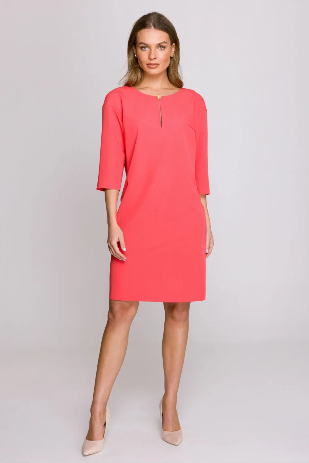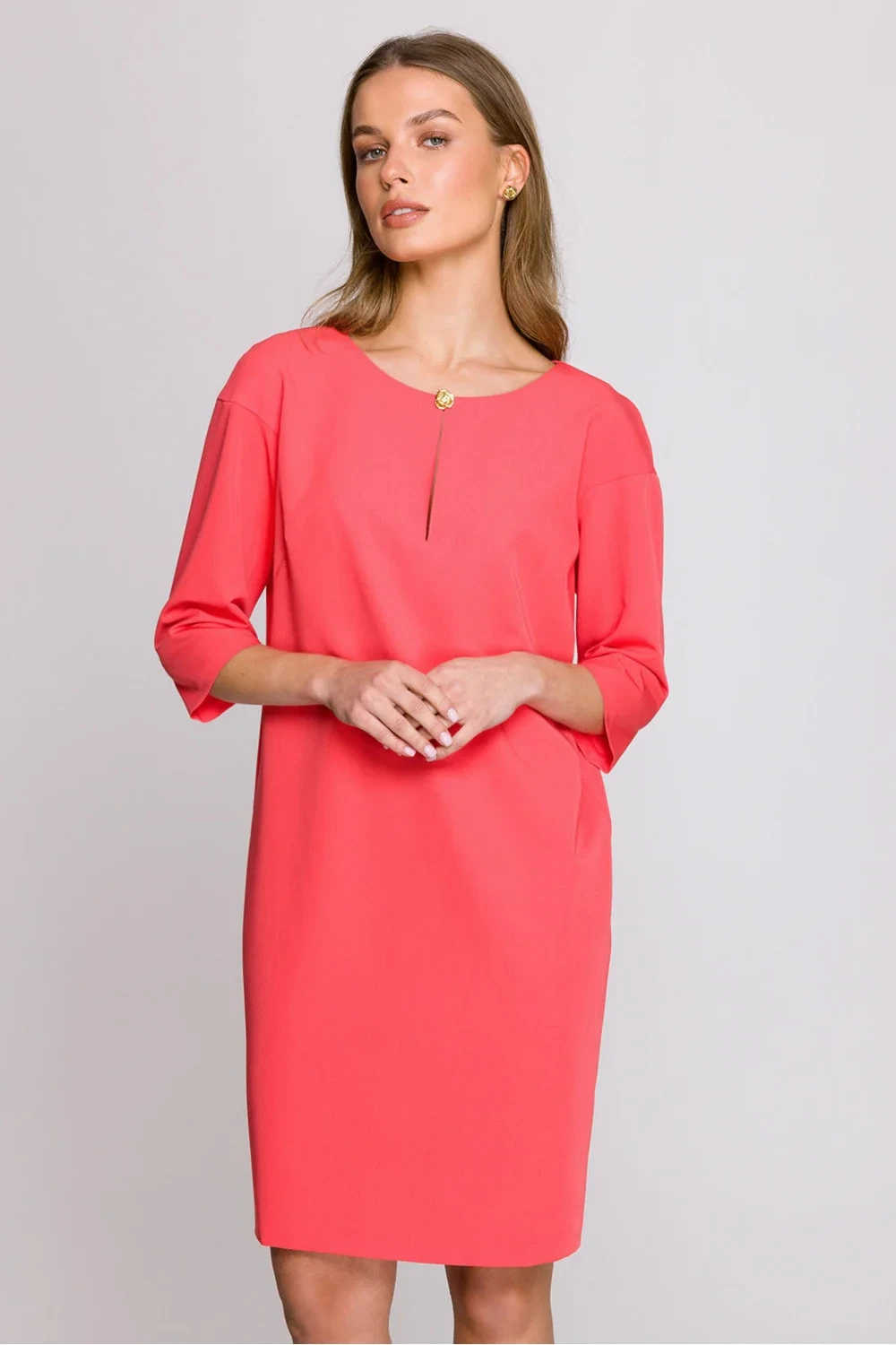 Volný a pohodlný šaty s volným střihem sahající před koleno. Má rukávy délky 3/4 a výstřih s jemným průstřihem zdobený elegantním knoflíčkem. Na zádech se zapíná na skrytý zip a dole je jemný rozpark, který poskytuje větší volnost pohybu. Model bez podšívky, ideální na různé příležitosti. Šaty byly navrženy a ušity v Polsku z vysoce kvalitní látky, která zaručuje pohodlí nošení a stylový vzhled.