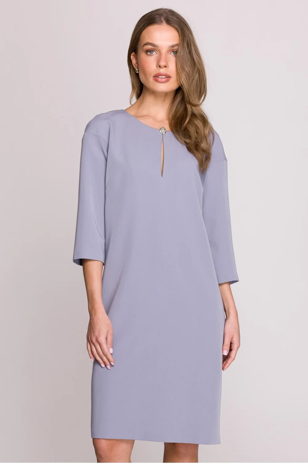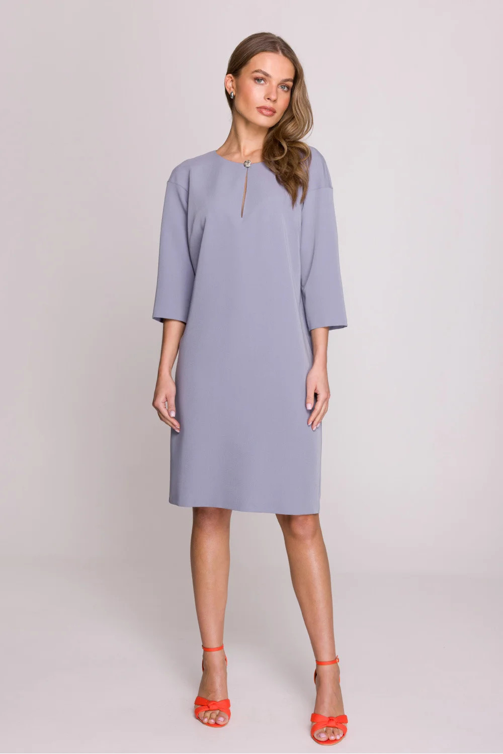 Volný a pohodlný šaty s volným střihem, sahající před koleno. Má rukávy délky 3/4 a výstřih s jemným prořezem, zdobený elegantním knoflíkem. Na zádech se zapíná na skrytý zip a dole je jemný rozpark, který zajišťuje větší volnost pohybu. Model bez podšívky, ideální na různé příležitosti. Šaty byly navrženy a ušity v Polsku z vysoce kvalitní látky, která zaručuje pohodlí nošení a stylový vzhled.