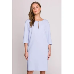 Volný a pohodlný šaty s volným střihem, sahající těsně nad koleno. Má rukávy o délce 3/4 a výstřih s jemným průstřihem zdobený elegantním knoflíkem. Na zádech se zapíná na skrytý zip a dole má jemný rozpark, který zajišťuje větší volnost pohybu. Model bez podšívky, ideální na různé příležitosti. Šaty byly navrženy a ušity v Polsku z vysoce kvalitní látky, která zaručuje pohodlí nošení a stylový vzhled.