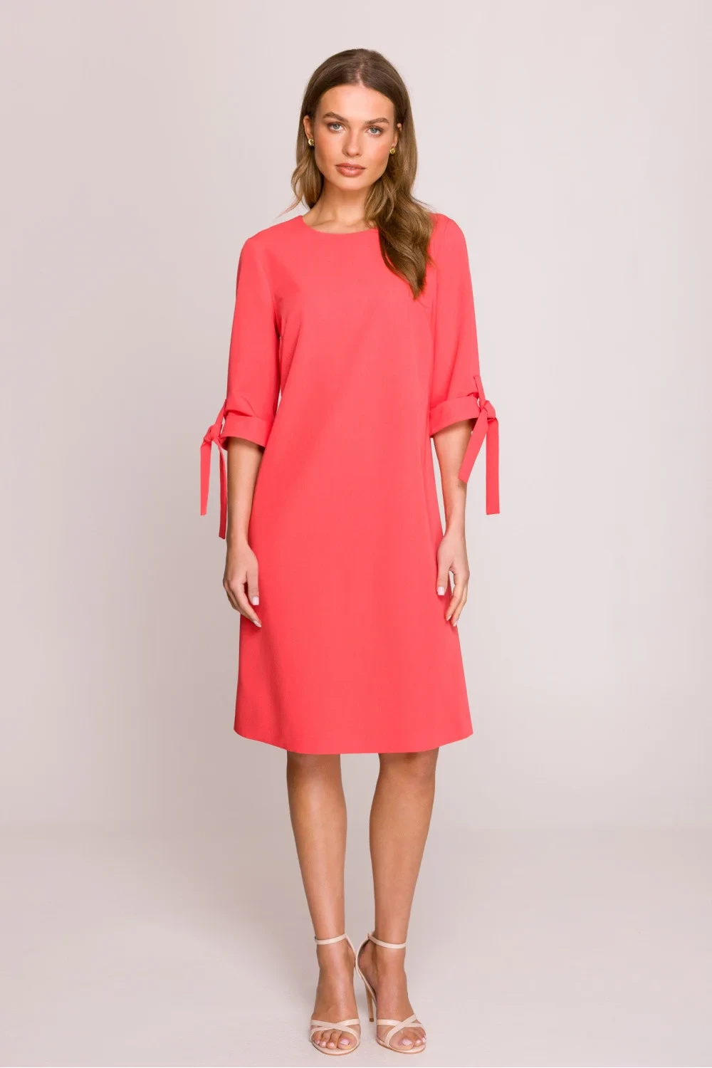 Šaty ve tvaru písmene A, které jemně zdůrazňují siluetu a zároveň si zachovávají elegantní a pohodlný charakter. Vyrobené z vysoce kvalitní látky, poskytující pohodlí po celý den. Délka po kolena jí dodává univerzálnost, dělá ji ideální jak na každý den, tak na formální události. 3/4 rukávy s ohrnutím a jemným vázáním jí dodávají lehkost a ženskost. Kulatý výstřih jemně zdůrazňuje krk a skrytý zip na zádech zajišťuje snadné oblékání. Šaty byly navrženy a ušity v Polsku, co zdůrazňuje jejich vysokou kvalitu a péči o detaily. Bez podšívky, co z nich dělá ještě lehčí a volnější na nošení. Ideální volba pro ženy, které oceňují eleganci, jednoduchost a pohodlí.