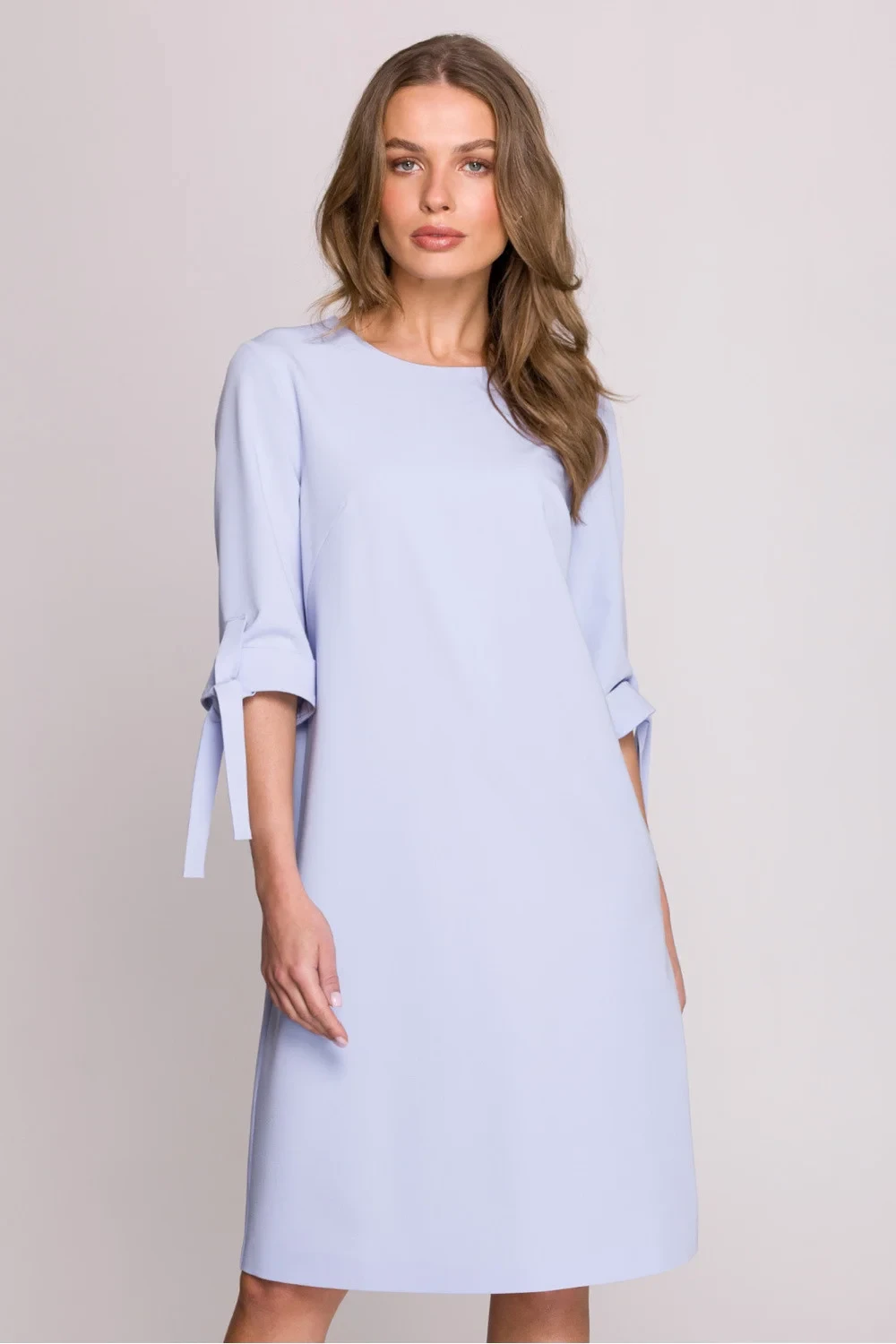 Šaty ve tvaru písmene A, které jemně zdůrazňují postavu, zachovávají elegantní a pohodlný charakter. Vyrobené z vysoce kvalitní látky, poskytující pohodlí po celý den. Délka nad koleno jí dodává univerzálnost, činí ji ideální jak na běžné nošení, tak na formální události. 3/4 rukávy s otočením a jemným vázáním jí dodávají lehkost a ženskost. Kulatý výstřih jemně zdůrazňuje krk, a skrytý zip vzadu zajišťuje snadné oblékání. Šaty byly navrženy a ušity v Polsku, co zdůrazňuje jejich vysokou kvalitu a pečlivost o detaily. Bez podšívky, co činí ještě lehčí a volnější v nošení. Ideální volba pro ženy, které oceňují eleganci, jednoduchost a pohodlí.