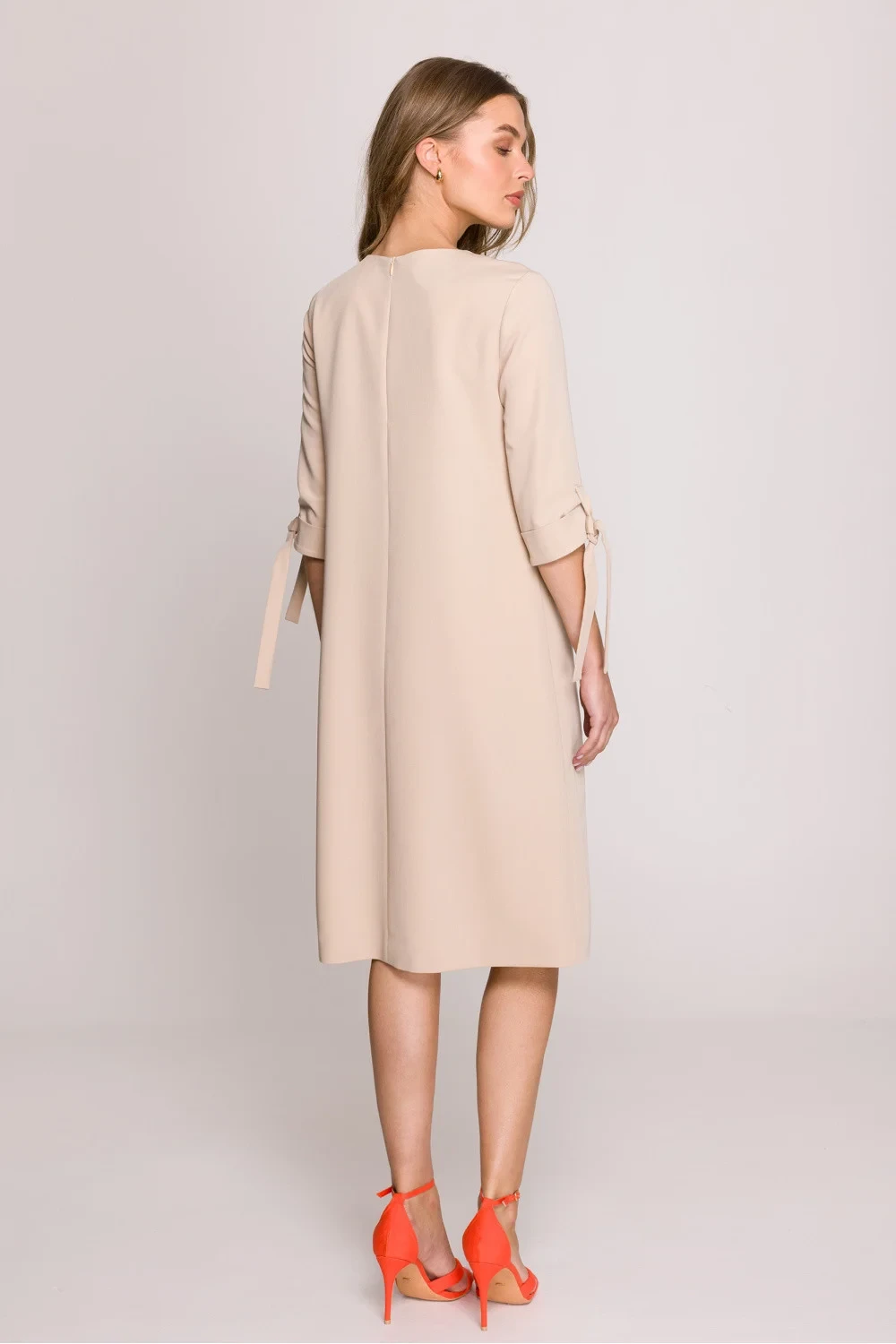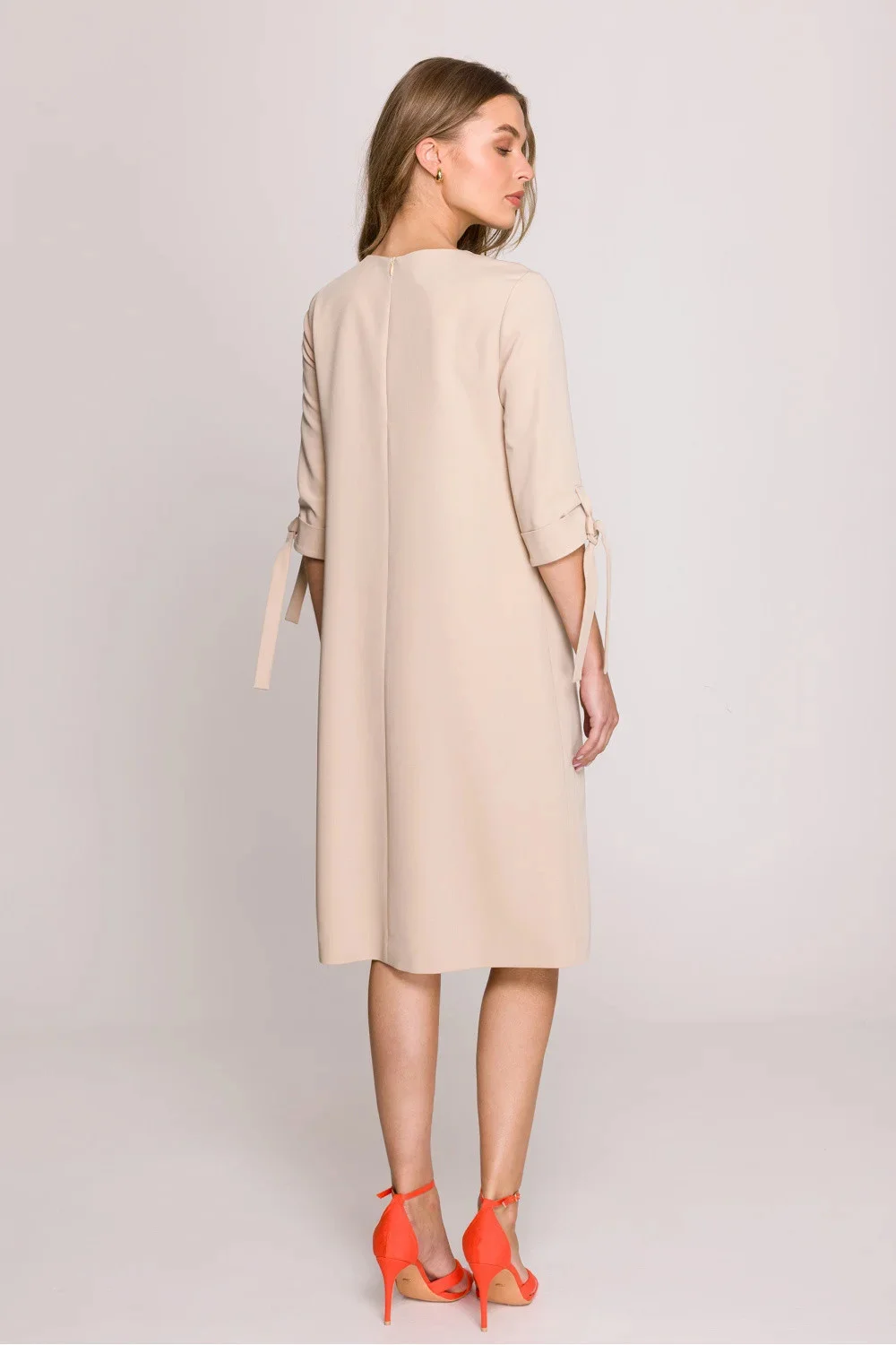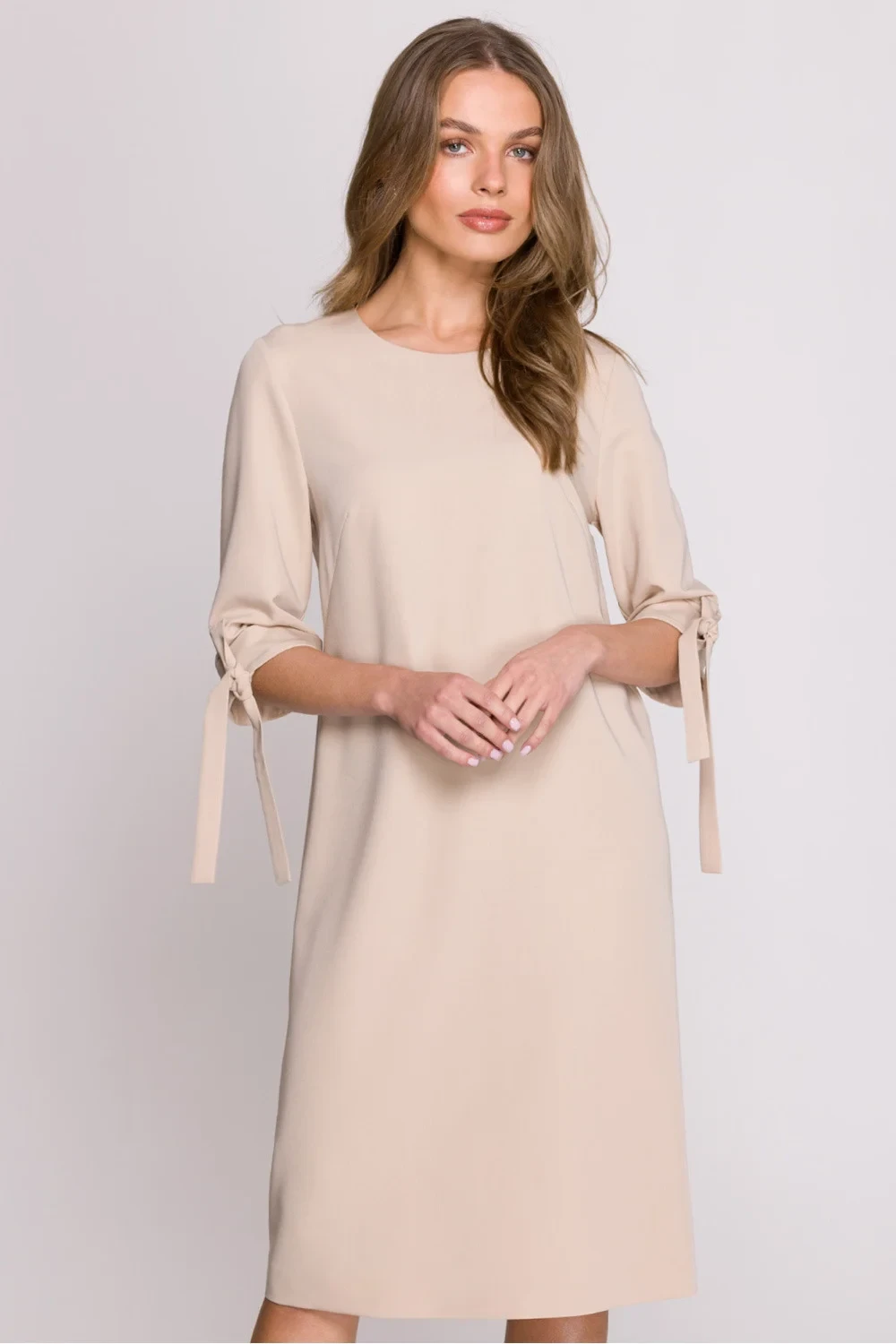 Šaty ve tvaru písmene A, které jemně zdůrazňují postavu a zároveň si udržují elegantní a pohodlný charakter. Vyrobené z vysoce kvalitní látky, poskytující pohodlí po celý den. Délka nad kolena jí dodává univerzálnost, co z ní činí ideální volbu jak do každodenního života, tak i na formální události. 3/4 rukávy s otočením a jemným vázáním jí dodávají lehkost a ženskost. Kulatý výstřih jemně zdůrazňuje krk, a skrytý zip na zádech zajišťuje snadné oblékání. Šaty byly navrženy a ušity v Polsku, co zdůrazňuje jejich vysokou kvalitu a péči o detaily. Bez podšívky, co z nich činí ještě lehčí a volnější na nošení. Ideální volba pro ženy, které oceňují eleganci, jednoduchost a pohodlí.