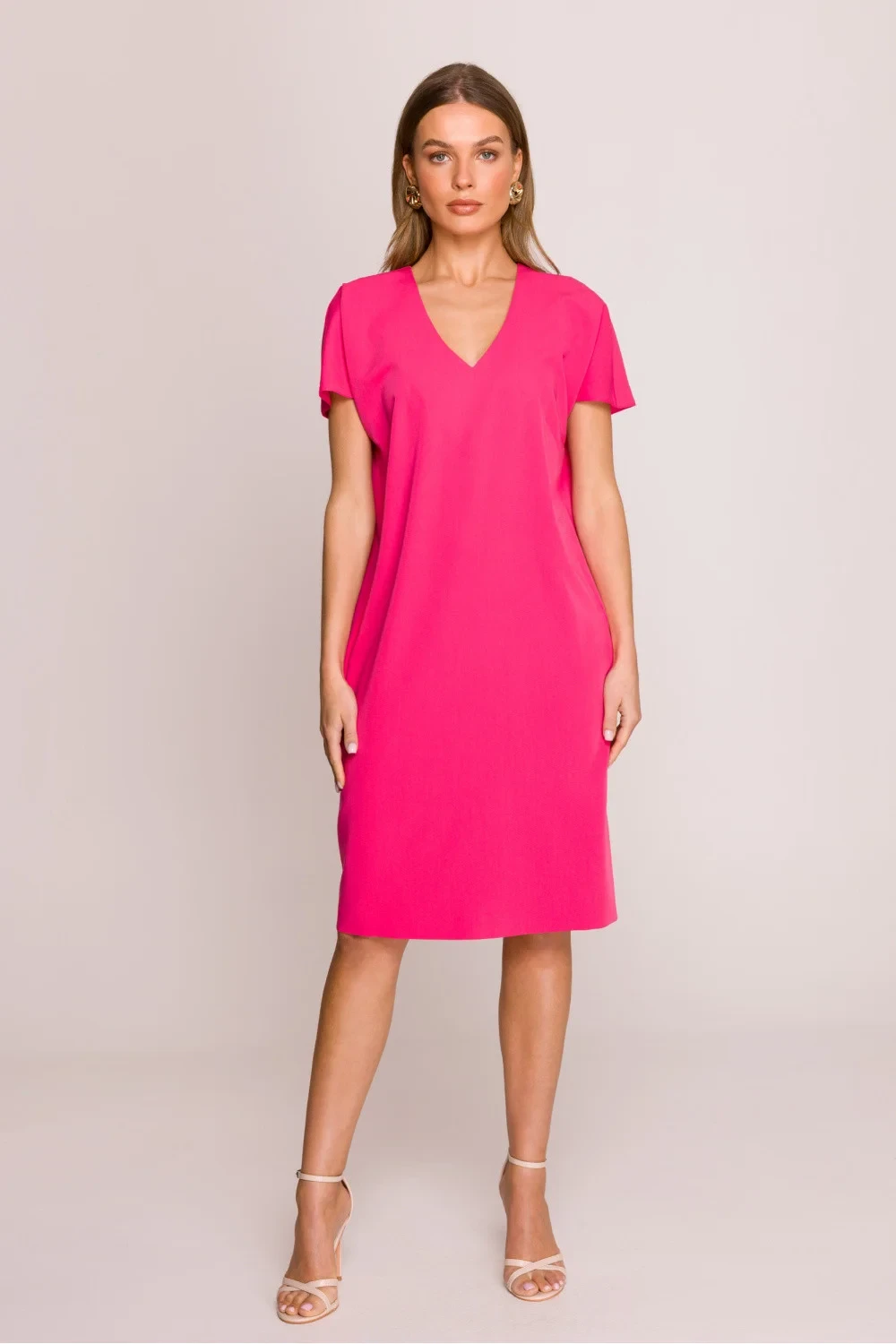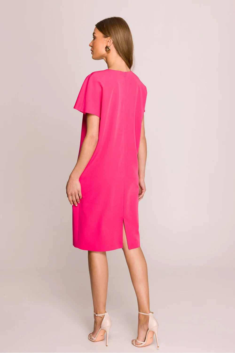 Šaty s volným střihem, který poskytuje volnost pohybu a pohodlí po celý den. Délka po kolena je univerzální volbou na mnoho příležitostí. Krátké rukávy dodávají lehkost, skvěle se hodí na teplejší dny. Výstřih ve tvaru písmene V jemně zdůrazňuje krk, dodávajíc šatům ženský charakter. Skrytý zip na zádech zajišťuje pohodlné oblékání a další rozpark na spodní straně zády dodává trochu elegantního akcentu. Šaty jsou bez podšívky, co je činí ještě vzdušnějšími a pohodlnějšími. Navrženo a ušito v Polsku, což zaručuje vysokou kvalitu provedení a péči o detaily. Skvělá volba pro ženy, které ocení styl, pohodlí a eleganci v každodenních outfitech.