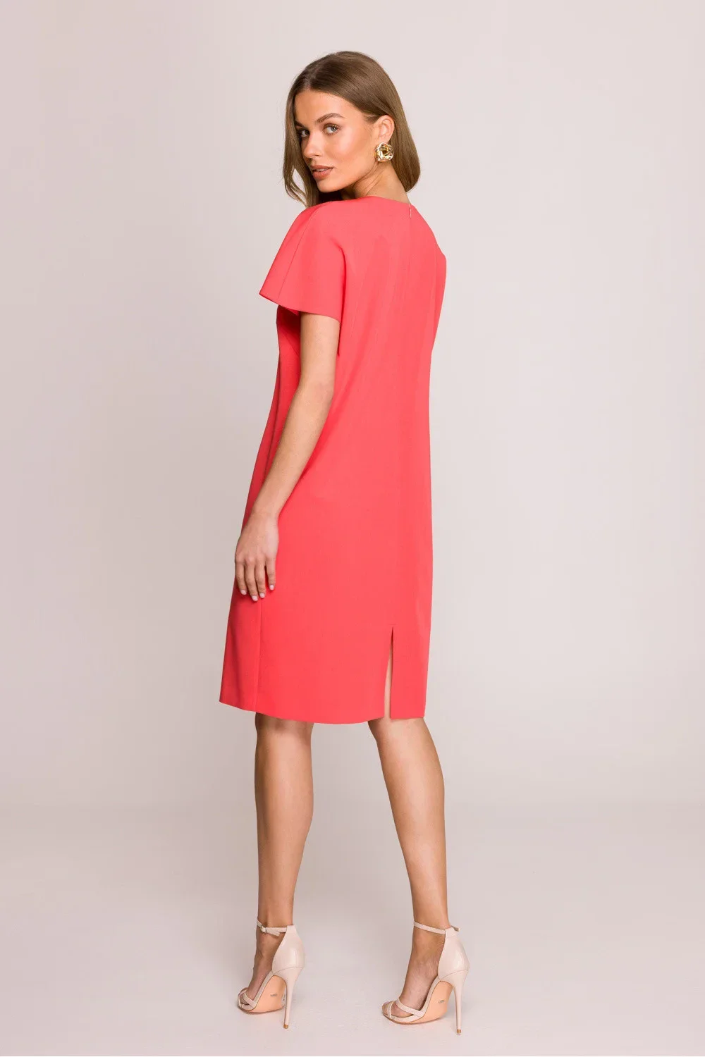 Šaty volného střihu, které zajistí volnost pohybu a pohodlí po celý den. Délka po kolena činí z těchto šatů univerzální volbu pro mnoho příležitostí. Krátké rukávy dodávají lehkost a skvěle se hodí do teplejších dnů. Výstřih ve tvaru písmene V decentně zdůrazňuje krk a dodává šatům ženský charakter. Skrytý zip na zádech zajišťuje pohodlí při oblékání a další rozpark na spodním okraji zezadu dodává šatičkám špetku elegantního akcentu. Šaty jsou bez podšívky, co je činí ještě prodyšnějšími a pohodlnějšími. Navrženo a ušito v Polsku, což zaručuje vysokou kvalitu provedení a péči o detaily. Skvělá volba pro ženy, které ocení styl, pohodlí a eleganci v každodenních outfitcích.