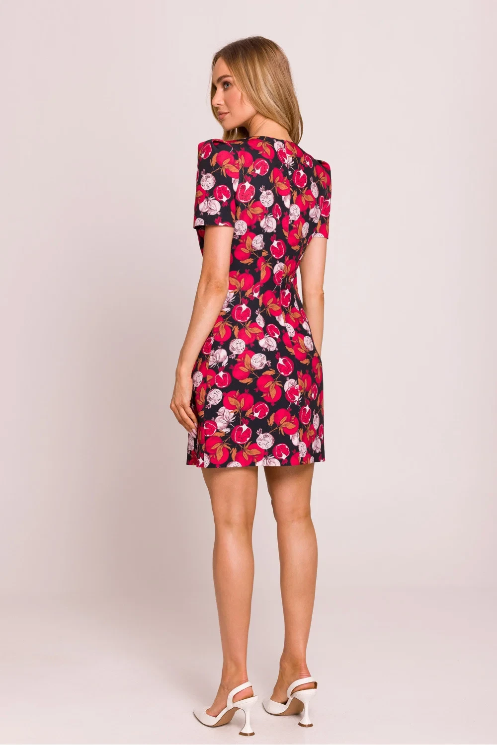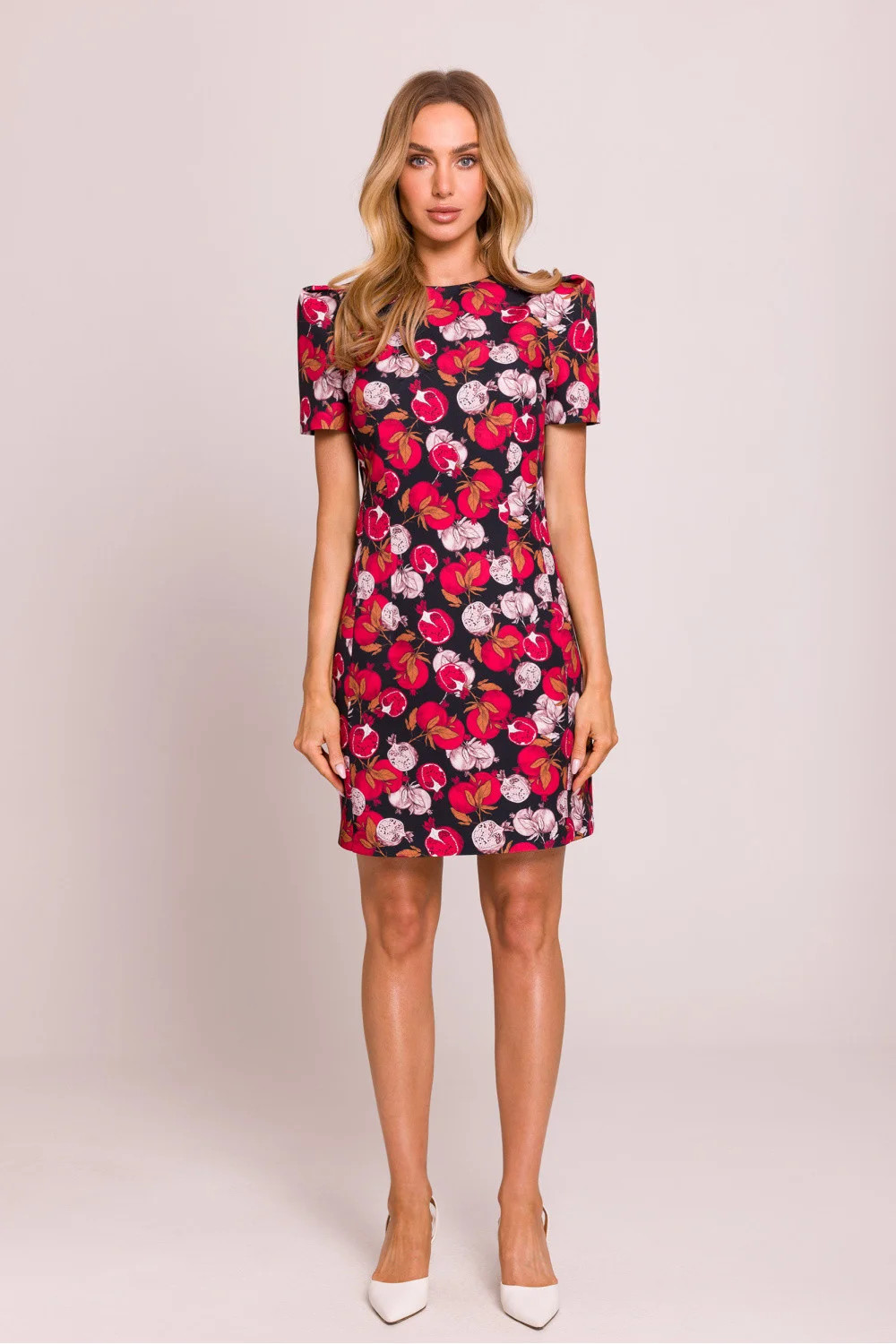 Elegantní a ženské mini šaty vyrobené z vysoce kvalitní látky s květinovým potiskem. Model zdůrazňuje pas díky jemným prošíváním a krátké rukávy na polštářcích jí dodávají výjimečný charakter. Šaty se zapínají vzadu na skrytý zip, co zajišťuje pohodlné nošení a estetické provedení. Chybějící podšívka zajišťuje, že jsou lehké a ideální na teplé dny. Celý kousek byl navržen a ušit v Polsku s důrazem na každý detail.
