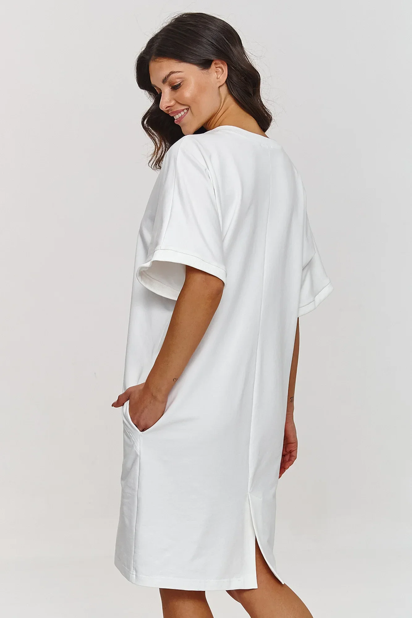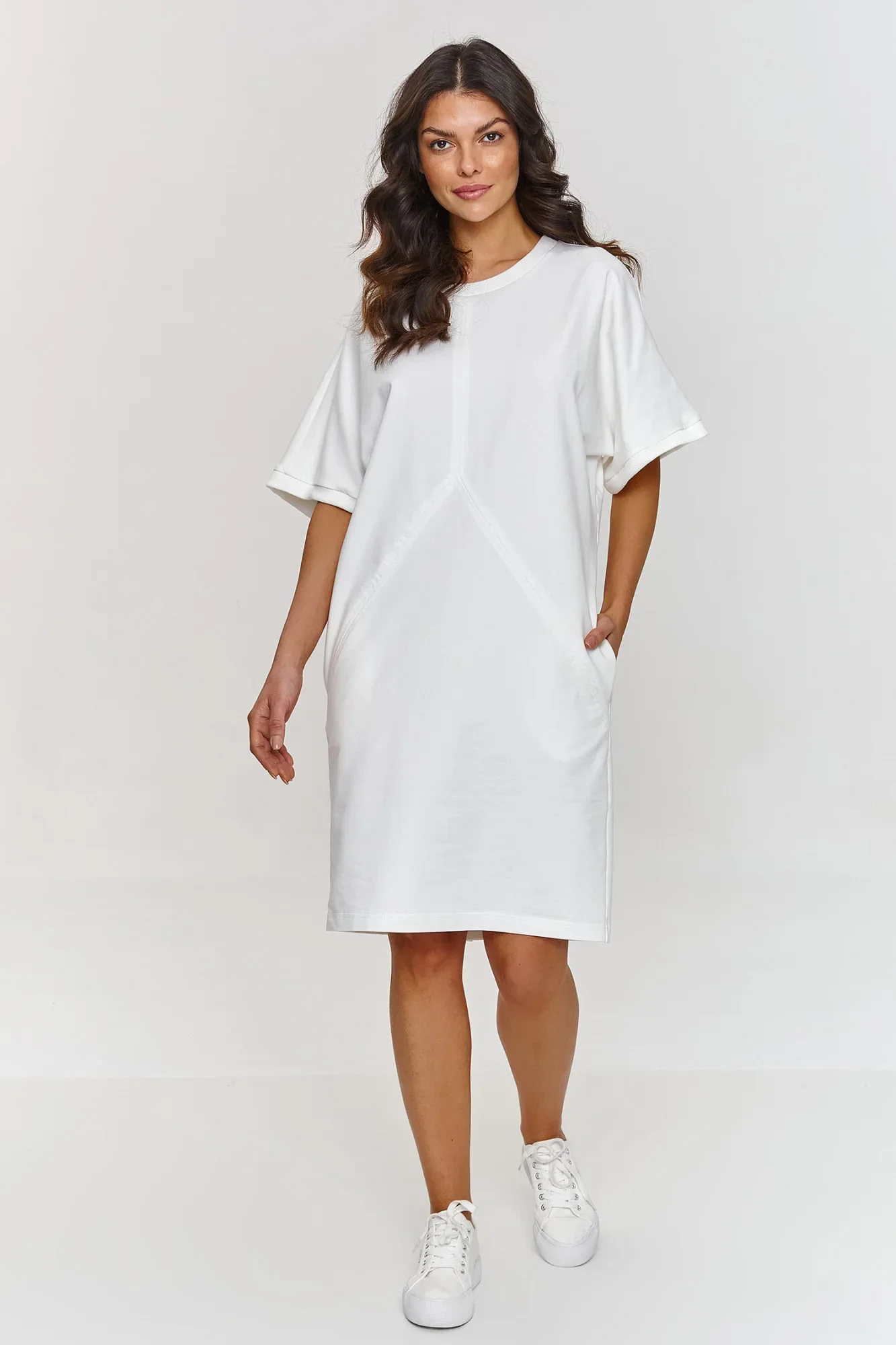 Šaty s krátkým rukávem jsou skvělou volbou pro ženy, které ocení jednoduchost a eleganci ve svých každodenních outfitcích. Jejich volný střih s lehkými detaily, jako jsou švy na přední straně, jí dodávají moderní a zároveň univerzální charakter. Široký rukáv sahající k lokti přináší volný, ležérní akcent a zároveň zůstává elegantní. Výstřih šatů má klasický, kulatý tvar, který decentně zdůrazňuje krk a zachovává jednoduchost outfitu. Kapsy na bocích jsou praktickým prvkem, který přidává funkcionalitu a zároveň zachovává minimalistický vzhled. Model má délku po kolena, což perfektně zdůrazňuje nohy a vytváří svěží, lehký vzhled. Šaty lze sladit s mnoha outfitovými styly a jsou skvělým pozadím pro módní doplňky. Můžete je zkombinovat s elegantními doplňky na večerní výstup nebo s ležérními na každý den. Díky jednoduchému, ale efektnímu střihu jsou ideální základ pro každý den, do práce, na setkání s přáteli nebo víkendový výlet. S jejich pomocí vytvoříte svěží, elegantní outfit, který snadno sladíte se svým stylem.