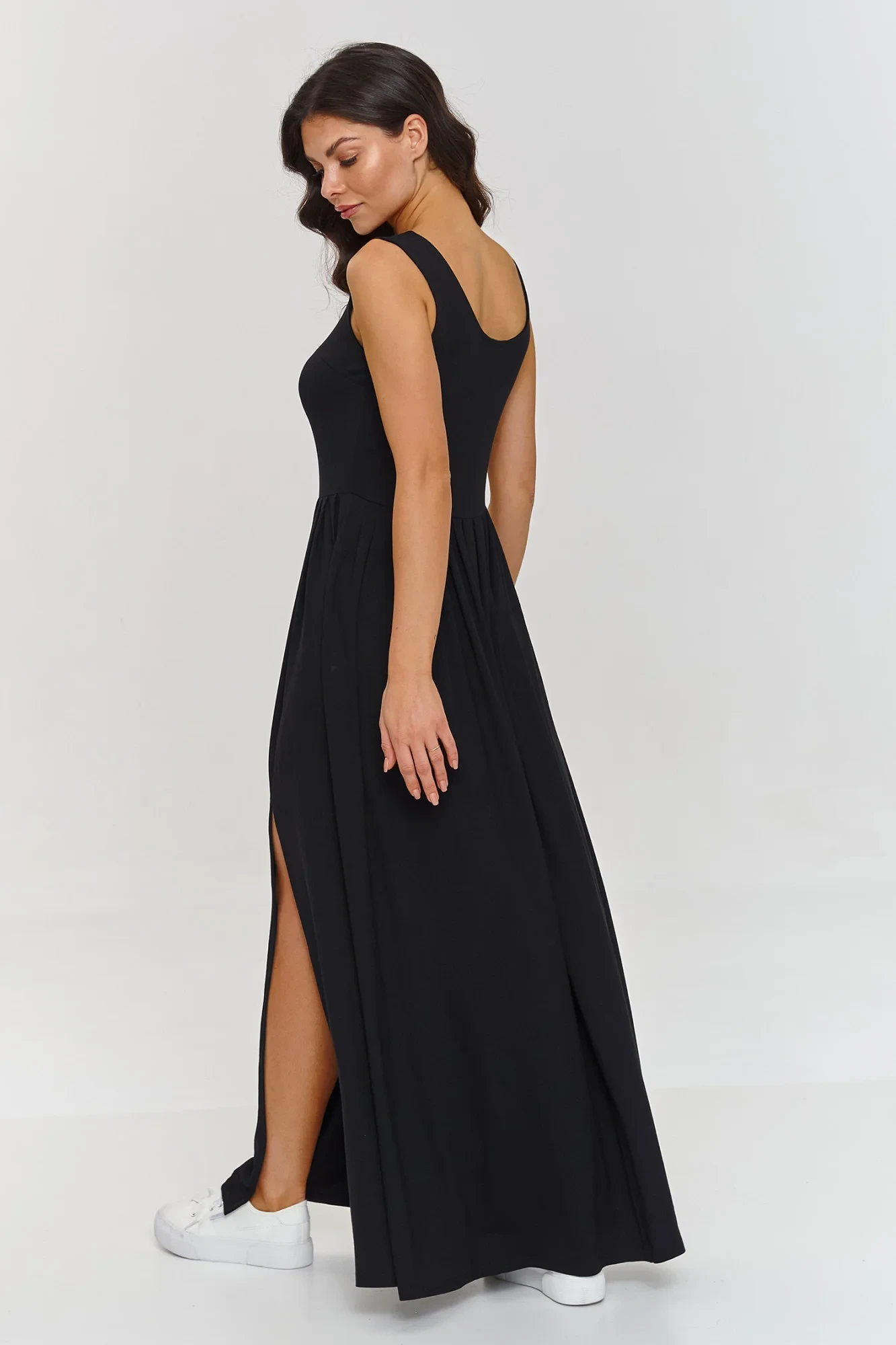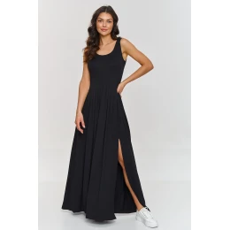 Tento maxi šaty jsou spojením elegance a pohodlí, ideální na jarní a letní dny. Vyrobené z příjemné viskózy, která zajišťuje prodyšnost a pohodlí při nošení. Šaty mají hluboký výstřih, který zdůrazňuje horní část postavy a široké ramínka zaručují univerzálnost a módní vzhled. Délka maxi opticky prodlužuje postavu a jemné záhyby zase zajišťují lehkost a plynulost pohybů, dodávají šatům dynamický a elegantní charakter. Subtilní rozpark z boku přináší prvek smyslnosti a ženskosti. Díky němu jsou šaty pohodlné na nošení a umožňují volnost pohybu. Maxi šaty s rozparkem jsou synonymem elegance a stylu, který se hodí jak do každodenních, tak do formálních stylizací, v závislosti na tom, jaké doplňky k nim zvolíte.