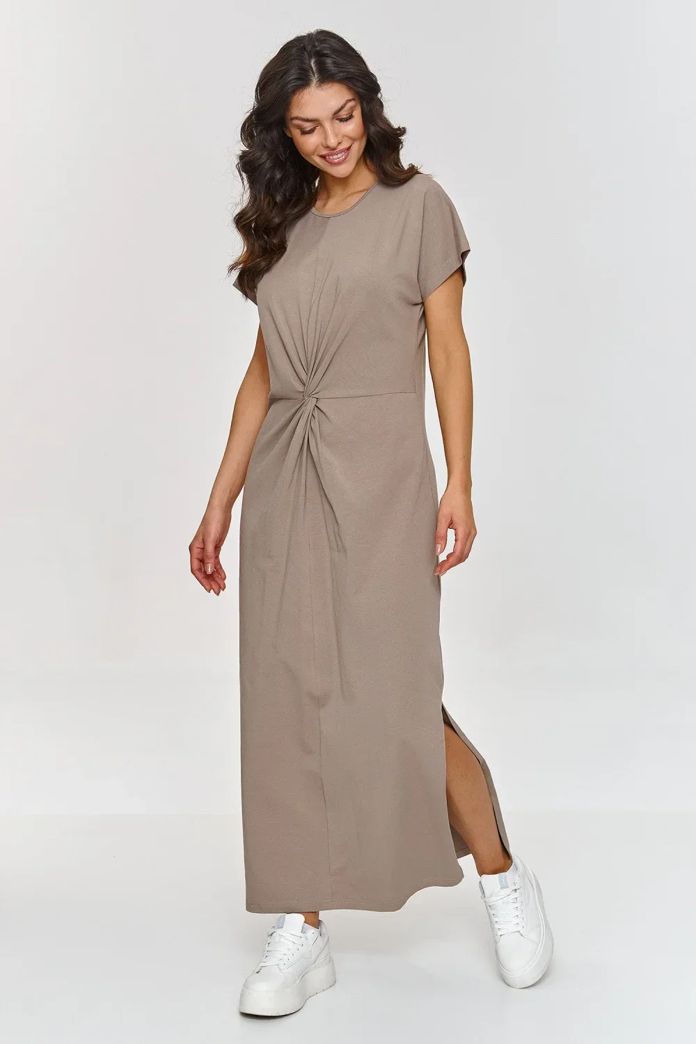 Tento maxi šaty jsou skvělou volbou pro ženy, které hledají spojení pohodlí a stylu. Model má jemné zvýraznění v pasu, které nejen zdůrazňuje ženskou siluetu, ale také jí dodává efektní design. Díky tomu vypadá celkově souvisle a stylově. Rozpark z boku jí dodává lehkost a smyslnost. Odkrývání jemných nohou do stylizace vnáší dynamický prvek a zároveň umožňuje větší volnost pohybu. Kulatý výstřih, krátký rukáv a maxi délka zdůrazňují univerzálnost celého modelu. Šaty jsou vyrobeny z lehkého, prodyšného bavlněného materiálu, ideálního na teplé dny. Díky němu může vaše kůže dýchat, poskytujíc vám pohodlí po celý den. Design spojuje v sobě minimalismus a eleganci. Díky jednoduchému střihu vypadají šaty svěže a moderně, skvěle se hodí jak do každodenních stylizací, tak na společenská setkání. Tato kreace skvěle ladí s bílými teniskami na každý den, stejně jako s elegantními sandály nebo lodičkami, vhodnými na večírky, výlety do města nebo letní procházky.