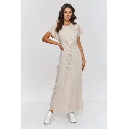 Tato maxi šaty jsou skvělou volbou pro ženy, které hledají spojení pohodlí a stylu. Model má jemné přeložení v pasu, které nejenže zdůrazňuje ženskou siluetu, ale také jí dodává efektní design. Díky tomu vypadá celkově souvisle a stylově. Boční rozříznutí jí dodává lehkost a smyslnost. Odkrýváním jemných nohou do stylizace vnáší dynamický prvek, zároveň umožňující větší volnost pohybu. Kulatý výstřih, krátký rukáv a maxi délka zdůrazňují univerzálnost celé kreace. Šaty jsou vyrobeny z lehkého, prodyšného bavlněného materiálu, ideálního na teplé dny. Díky tomu může kůže dýchat, poskytující vám pohodlí po celý den. Projekt spojuje v sobě minimalismus a eleganci. Díky jednoduchému střihu vypadají šaty svěže a moderně, skvěle se hodící jak do každodenních stylizací, tak na společenská setkání. Kreace skvěle ladí s bílými teniskami na každý den, stejně jako s elegantními sandály nebo lodičkami, vhodnými na večírky, výlety do města nebo letní procházky.