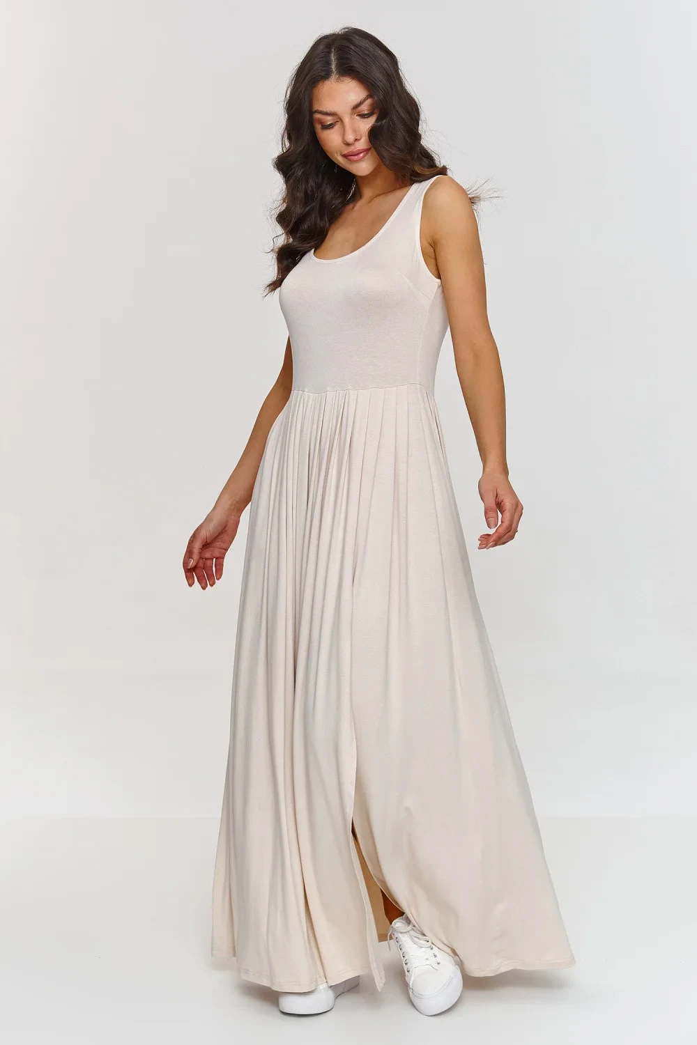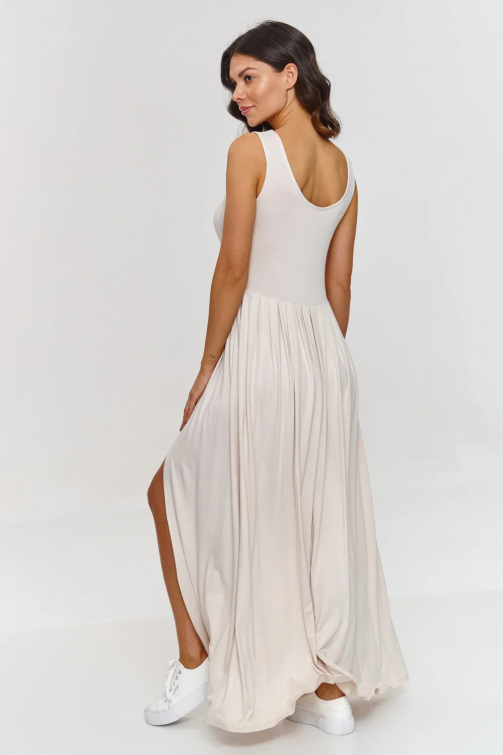 Tento maxi šaty jsou kombinací elegance a pohodlí, ideální na jarní a letní dny. Vyrobené z příjemné viskózy, která zajišťuje prodyšnost a pohodlí při nošení. Šaty mají hluboký výstřih, který zdůrazňuje horní část postavy a široké ramínka zaručují univerzálnost a módní vzhled. Maxi délka opticky prodlužuje postavu a jemné záhyby zajišťují lehkost a plynulost pohybů, dodávají šatům dynamický a zároveň elegantní charakter. Jemné rozštěpení na boku přináší prvek smyslnosti a ženskosti. Díky němu jsou tyto šaty pohodlné a umožňují volný pohyb. Maxi šaty s rozštěpením jsou synonymem elegance a stylu, které se skvěle hodí jak do každodenních, tak do formálních stylizací v závislosti na tom, jaké doplňky k nim zvolíte.
