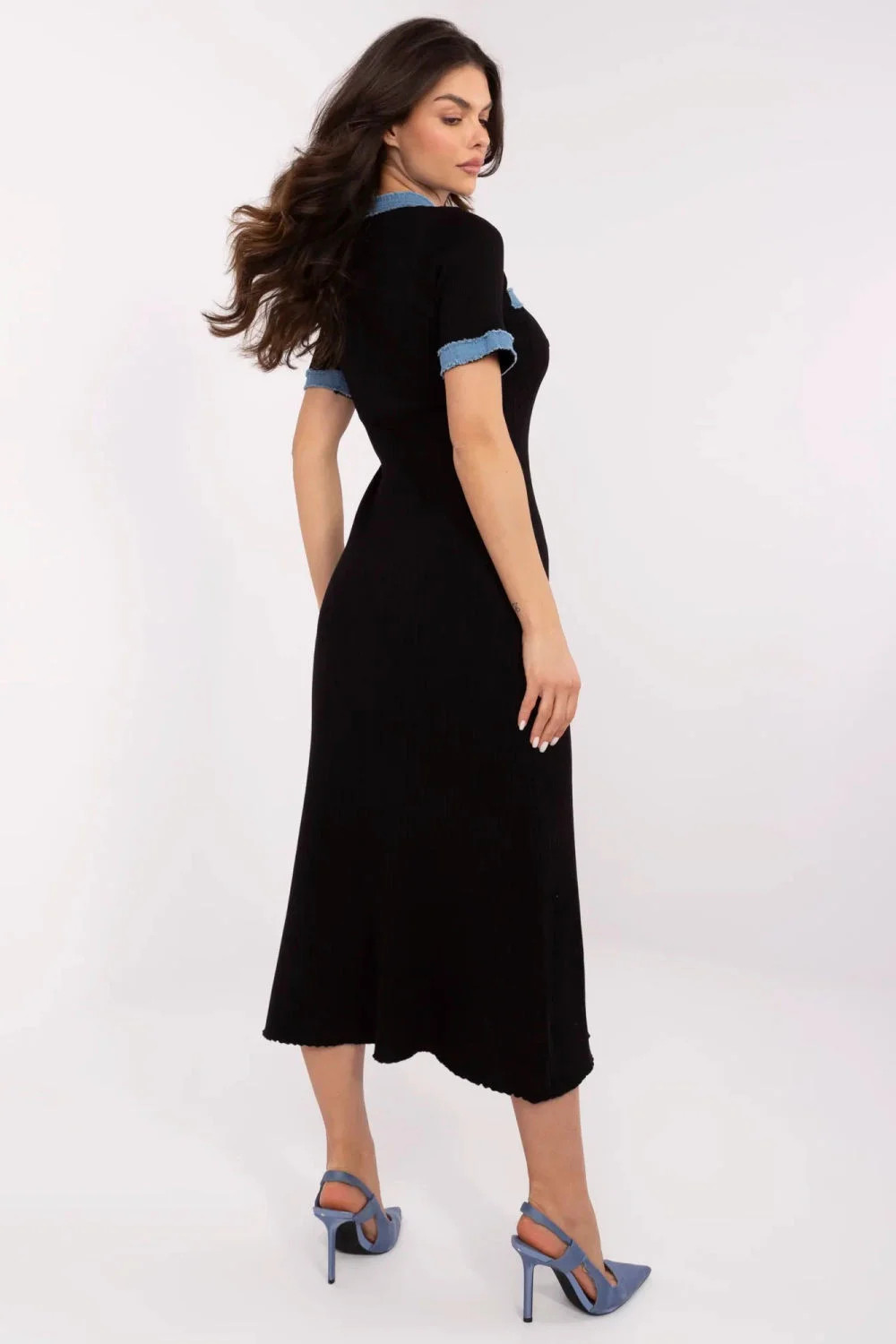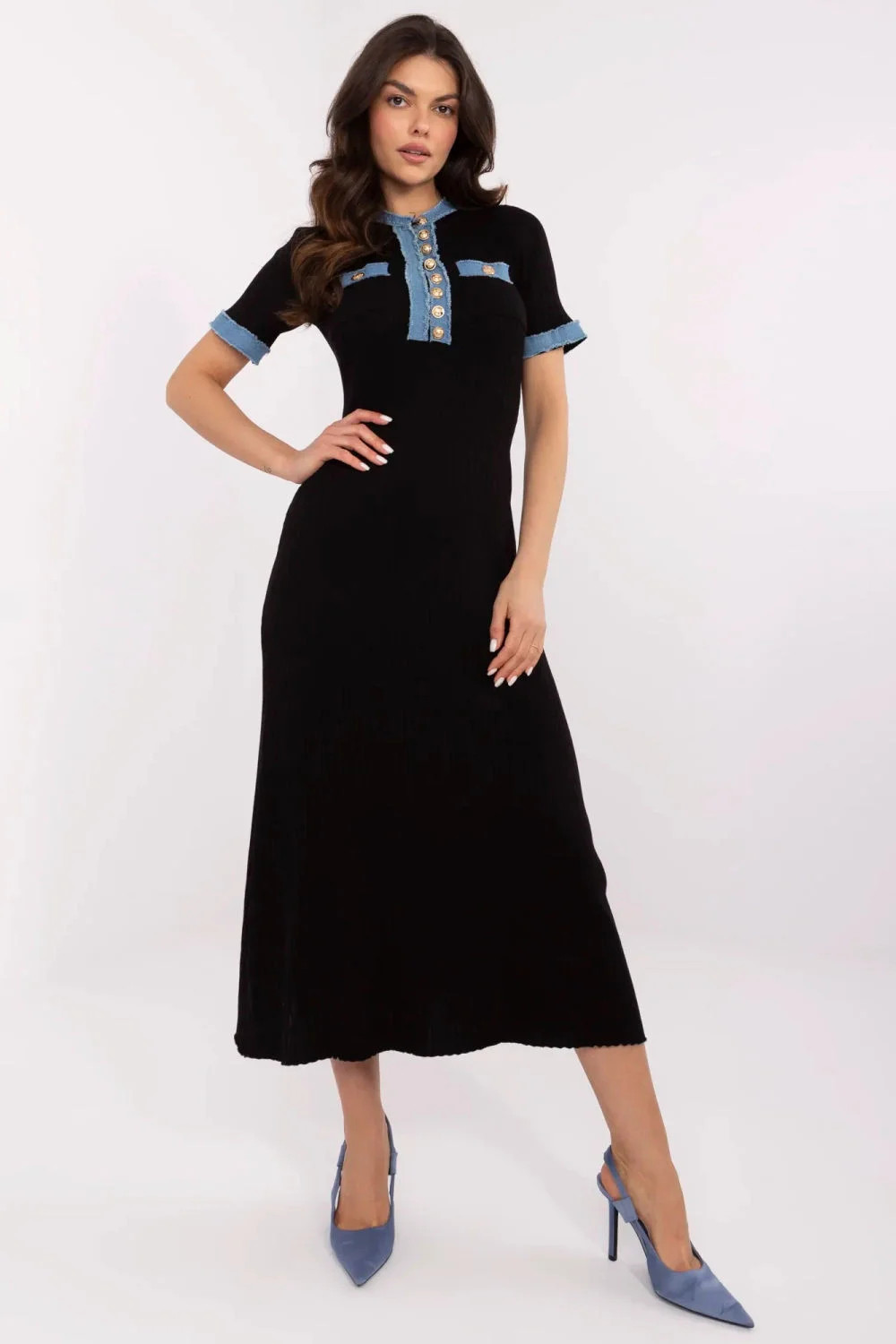 Pletené midi šaty jsou ideální volbou na každý den i do práce. Vyrobené z měkké a elastické směsi viskózy a polyamidu, poskytují pohodlí během celého dne. Hladký, žebrovaný materiál skvěle sedí na postavě, zdůrazňuje její výhody. Šaty mají klasický, kulatý výstřih a krátké rukávy, což je činí univerzální volbou na různé příležitosti. Zapínání na knoflíky vpředu na krátkém úseku přidává jemný šarm, zdůrazňuje ženský charakter střihu. Je to nadčasová volba, která se osvědčí jak v kanceláři, tak v každodenních outfitech.