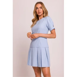 Šaty mini vyrobené z vysoce kvalitní bavlněné látky, která zaručuje pohodlí a prodyšnost. Střih s prodlouženým pasem decentně zdůrazňuje postavu, a kontrafałdy v dolní části jí dodávají lehkost a eleganci. Krátké rukávy jsou zdobené švy a dekorativními knoflíky, co dodává celku výjimečný charakter. Šaty se zapínají na skrytý zip na zádech, bez podšívky, co zajišťuje, že jsou lehké a příjemné na nošení. Navrženy a ušity v Polsku s pečlivostí o každý detail.