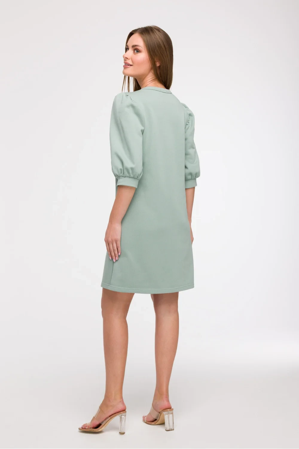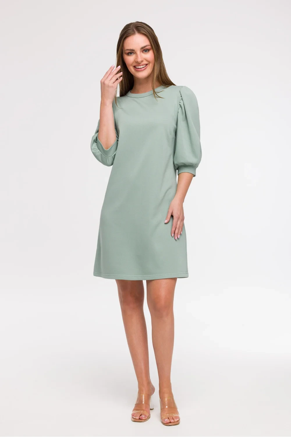 Lehké a stylové šaty s volným, nesedícím střihem jsou ideální volbou na každý den, hodí se jak na dovolené, tak na procházky ve městě. Vyrobené v Polsku s ohledem na pohodlí a ženský styl, okouzlují jemným střihem ve tvaru písmene A, který se jemně rozšiřuje dolů, poskytující volnost pohybu. Šaty sahají před koleno, mají kulatý výstřih do krku a efektní 3/4 rukávy s nafouklým střihem a manžetou dodávají celku romantický charakter. Bez podšívky jsou šaty vzdušné a lehké, ideální na teplejší dny. Díky svému střihu se šaty hodí k mnoha typům postav, a zejména dobře vypadají na postavě typu Y, rozšiřující se spodek vyvažuje poměr mezi rameny a boky.