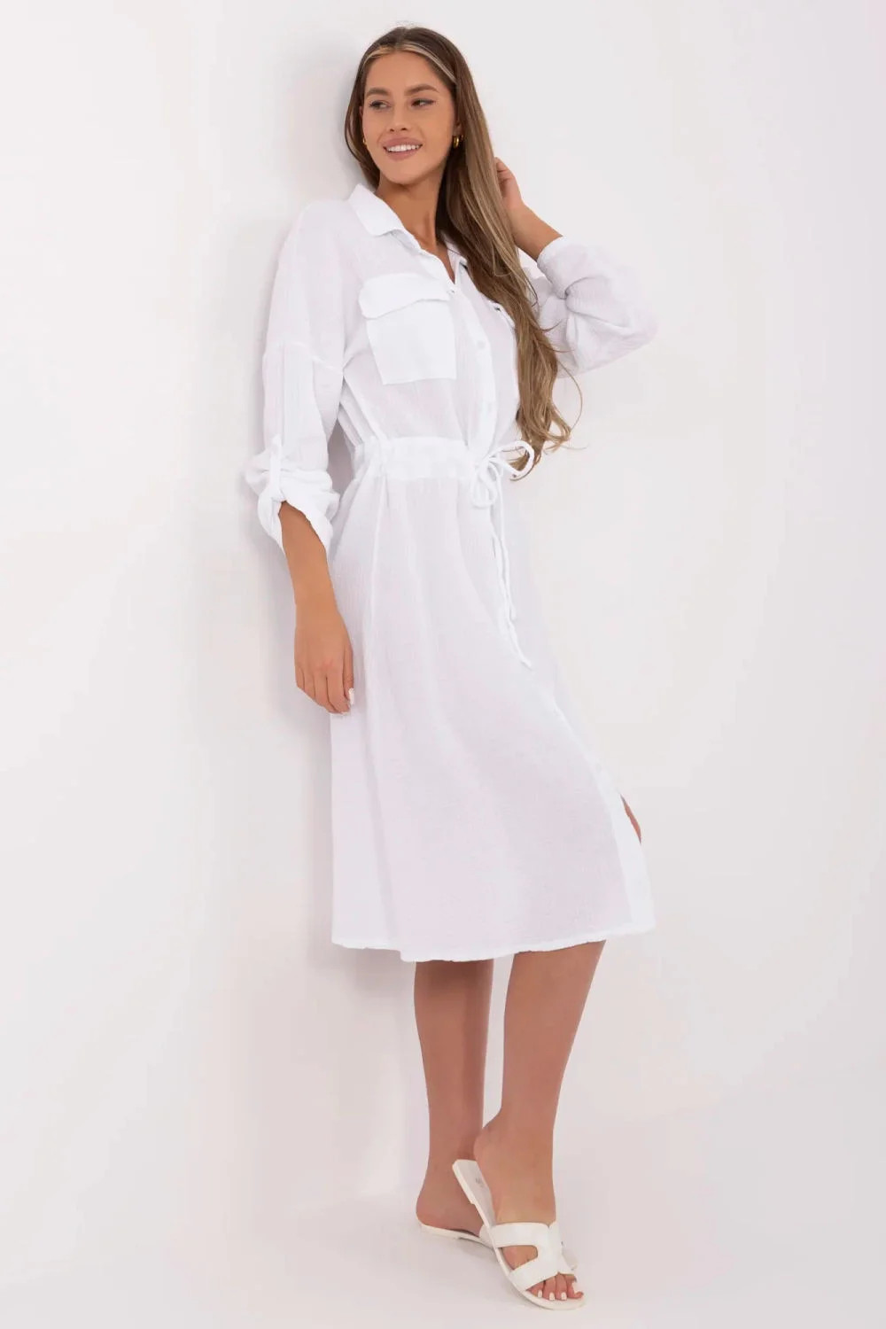 Elegantní letní šaty se střihem košile, vyrobené z prodyšné přírodní bavlny. Hladký materiál a klasická délka midi dělají z modelu skvělý kousek do každodenního oblékání. Mají dlouhý rukáv s možností zapínání, praktický límeček a knoflíky po celé délce. Šňůrka v pasu jemně zdůrazňuje pas, a kapsy s patkami v oblasti hrudníku dodávají funkčnost a charakter. Ideální na procházku, do práce nebo na setkání s přáteli, univerzální a vždy stylové.
