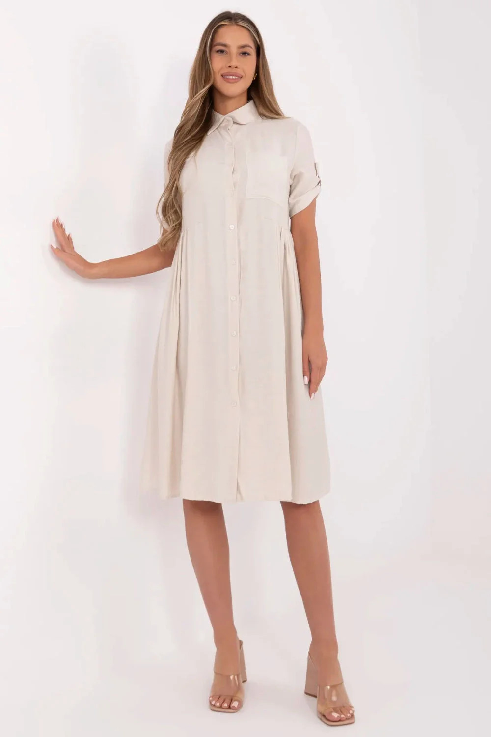Rozkloszované košilové šaty midi délky, vytvořené s ohledem na každodenní pohodlí a styl. Vyrobena z lehké směsi viskózy a nylonu, poskytuje prodyšnost a jemný lesk. Hladká tkanina zdůrazňuje její univerzální charakter, ideální jak do práce, tak na volnější setkání. Šaty mají klasický límec, krátké rukávy a zapínání na knoflíky. Dekorativní rouchaští přidávají ženský půvab a praktická kapsa na hrudi prolamuje jednoduchý tvar. Skvělý návrh na každou příležitost, kdy chcete vypadat uvolněně a elegantně.